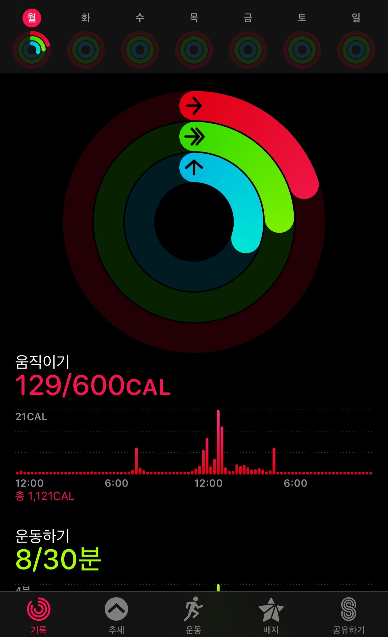 나는 움직이기 목표를 600cal으로 잡았다. 목표는 현실적으로 달성 가능하면서도 목적을 이루기에 부합해야 했다. 운동을 의식하지 않고 애플워치를 차고 다녔던 동안 나의 평균적인 '움직이기' 수치는 300cal였다. 그래서 하루 동안의 일상적인 활동(300cal)+1시간 정도의 가벼운 운동(300cal)으로 채울 수 있는 600칼로리를 목표로 잡았다.