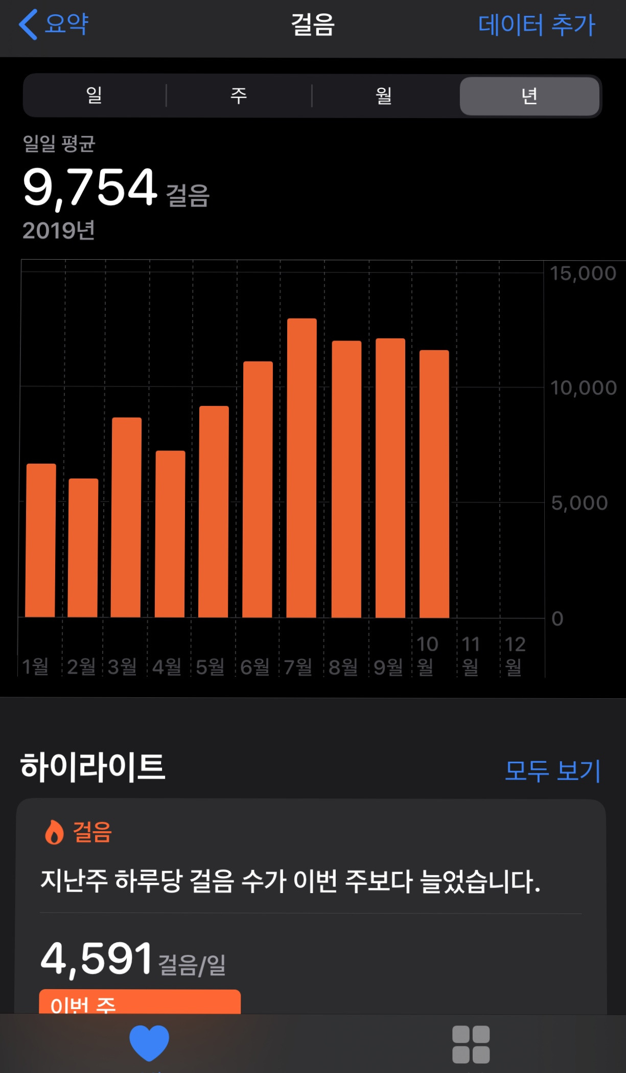 그래프를 보면 올 초와 비교했을 때 나의 평균 걸음 수가 많이 늘어났음이 보인다. 올 초엔 무릎이 아파서 더 못 걷기도 했다. 남은 11월, 12월에도 날이 좀 추워도 열심히 걸어서 연평균 걸음 수 만 보를 넘기는 게 목표다. 혹시 누군가 무릎이 아파서 고생하다가 이 글을 보게 된다면, 내 글이 조금이라도 도움이 되면 좋겠다. 아프지 맙시다(ㅠㅠ)