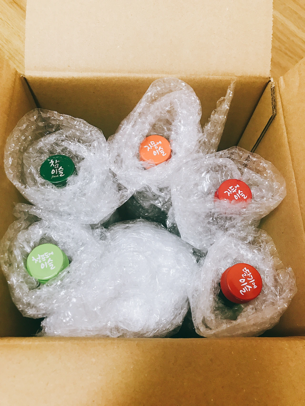 가장 지치고 따분하지만 바쁜 시간. 목요일 오후 3시 즈음에 도어벨이 울렸다. 기다리는 택배가 없는데 무슨 일일까? 한국에서 깜짝 선물이 온 걸까? 기대하며 받은 택배 안에는 소주가 한 병씩 정성스럽게 쌓여있었다.