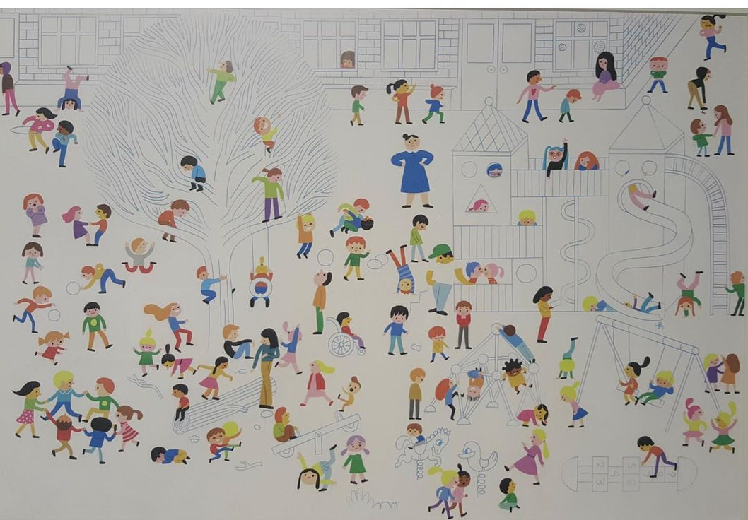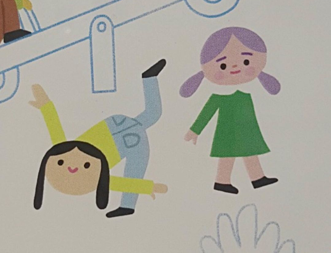 <A Travers>을 덮고 몇 작품을 더 지나 전시장의 끝에 다다랐을 때였다. 사람들이 많이 그려진 일러스트가 눈에 들어왔다. 놀이터를 배경으로 한 그림 <모두의 수> 속에는 서로 다른 이야기를 가진 아이들이 보였다. 물구나무를 서는 아이, 휠체어에 탄 아이, 엎드려 있는 아이, 혼자 놀이를 즐기는 아이, 어딘가 시무룩해 보이는 아이. 각각의 아이들이 가지고 있을 법한 이야기를 상상하며 한참을 쳐다봤다. 그러다 친구와 나를 닮은 아이들을 발견하기도 했다. 다리 한쪽을 들고 즐거워하는 검은 머리 아이와 그런 친구를 부끄러워하는 것 같으면서도 미소 짓고 있는 보라색 머리의 아이.