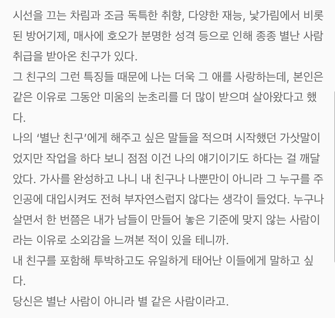 그리고 본인이 주인공인 가사이기에 그녀만의 감정과 생각이 온전히 담겨있다는 느낌마저 들었다.