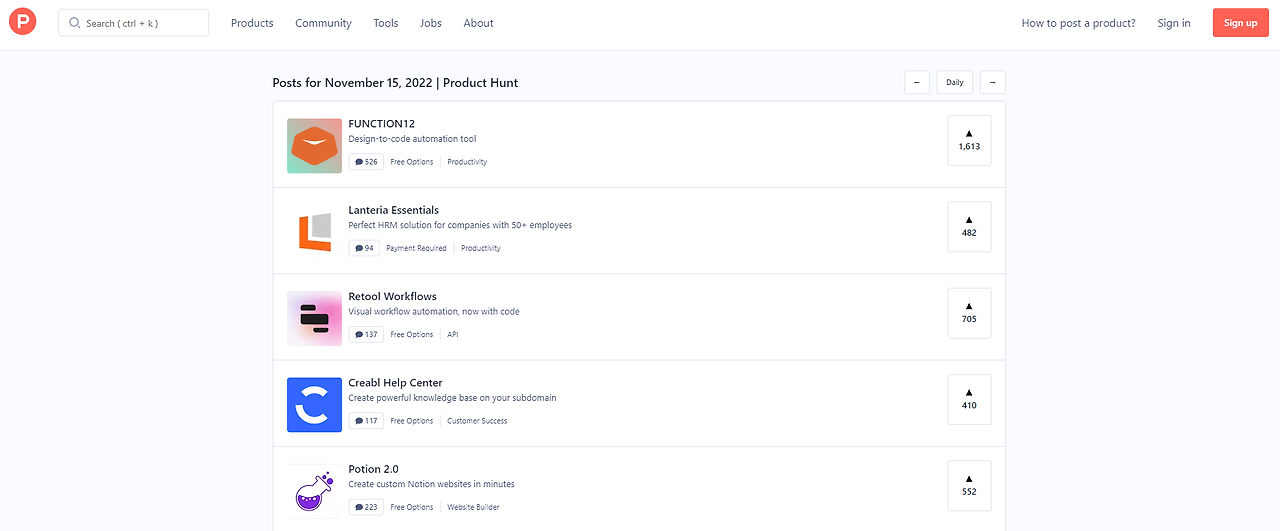 프로덕트 헌트는 테크 스타트업계의 글로벌 빌보드 차트로 여겨지고 있으며 가장 최신의 인기 있는 테크 스타트업 제품을 순위대로 보여주는 플랫폼이다. 노션, 피그마, 슬랙 등 여러 유명한 SaaS 제품들도 이곳에 제품 소개를 한 이력이 있으며 해외에선 글로벌 SaaS 서비스 론칭 시 한 번쯤 거쳐야 하는 등용문으로 여겨지고 있다.
