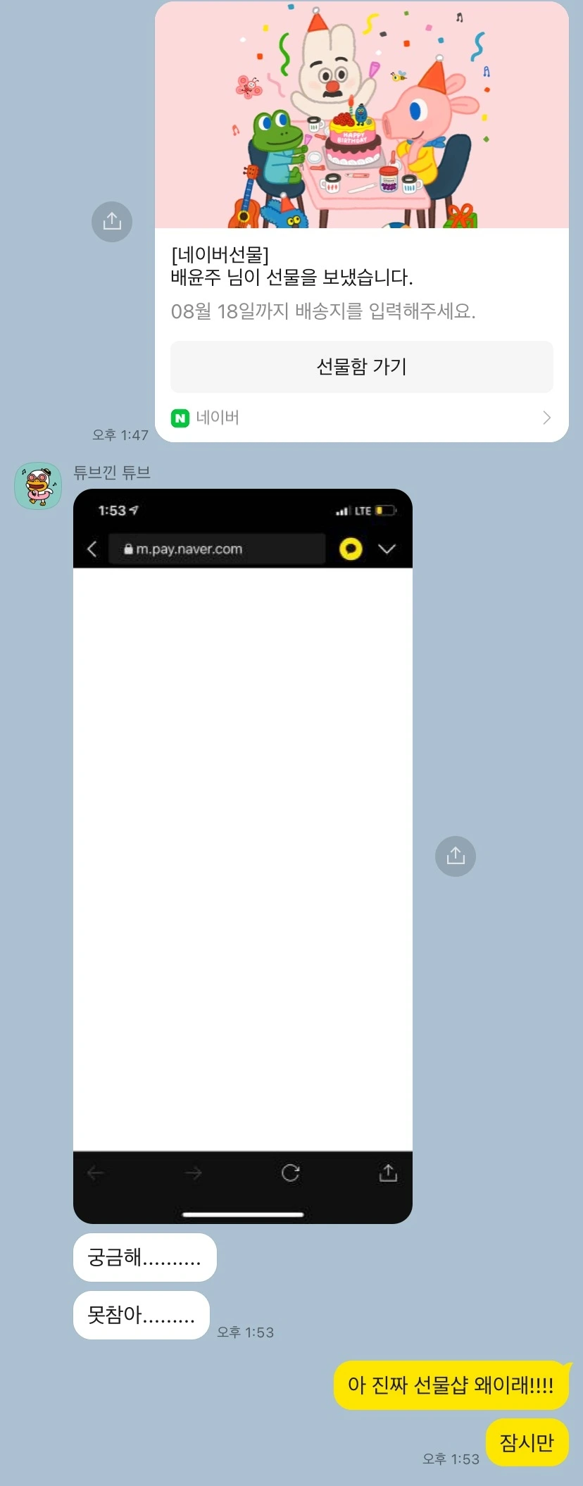 아니 근데 상식적으로, 내가 선물도 사고 카드도 썼는데, 상대방에게 어떤 방식으로 전달되는지 궁금하니까 카톡방에서 상대방이 보기 전에 링크를 눌러볼 수도 있는 거 아닌가?