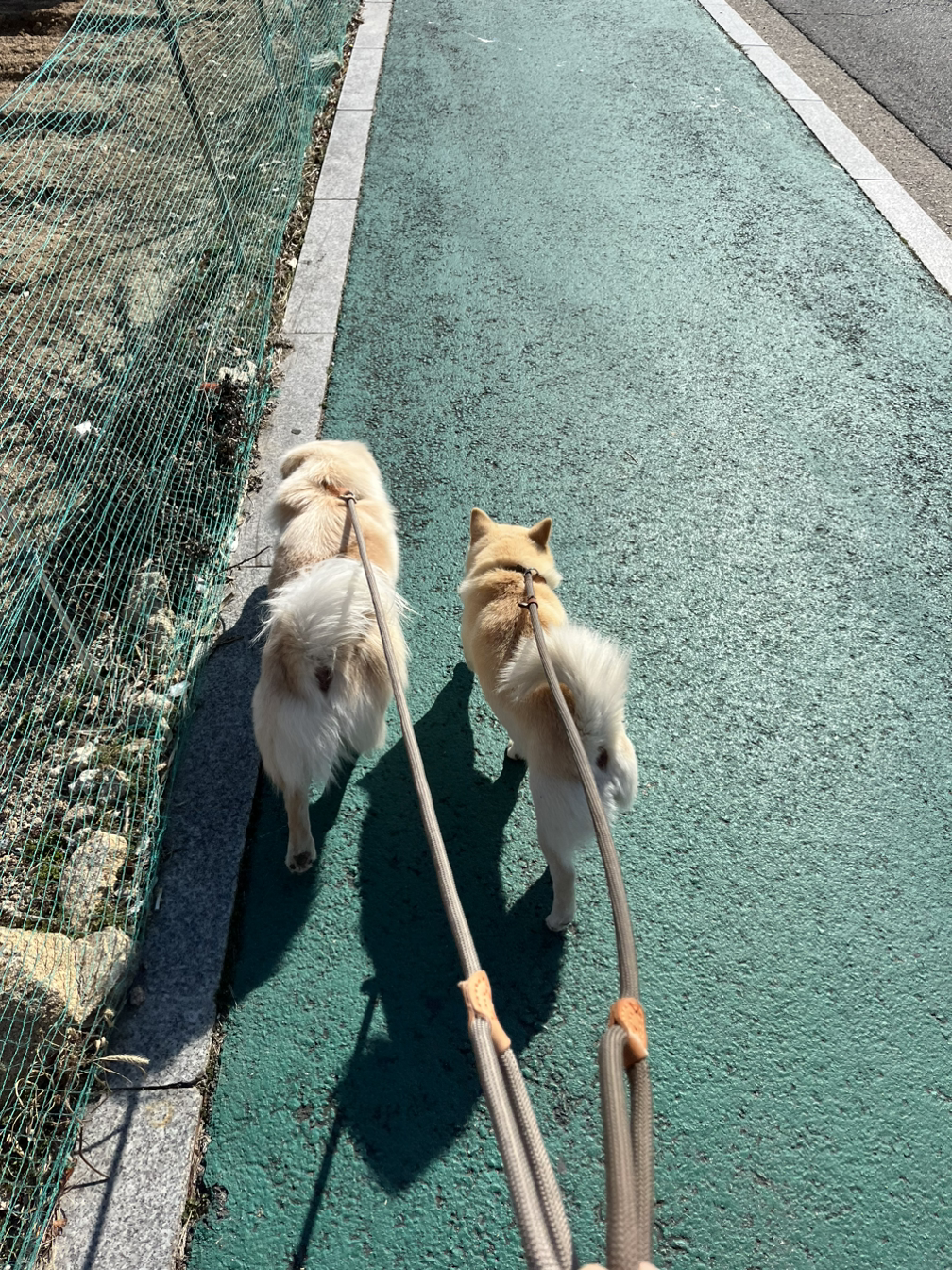강아지 강씨 강형욱님이 한 마리씩 산책이 좋다 해서 시간이 있을 때는 한 마리씩 하려 합니다. 오래 도는 날은 두 번 돌기가 힘들어서 두 마리 함께 산책하는데요, 여전히 발이 안 맞는 바보 형제입니다.