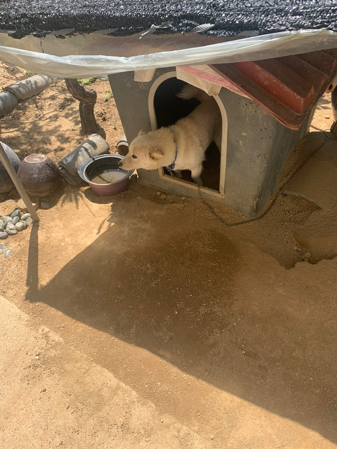 그렇게 우리 가족은 개를 보러 나무 가게에 들르게 되었다. 개는 마당 한편에 마련된 집에서 쉬고 있었다. 하얀 여우 같았다. 겁이 많은지 자신들을 보러 온 인간들에 화들짝 놀란 똥개. 비록 목줄에 묶인 채였지만 주인을 보고 꼬리 치는 모습과 뜨거운 햇빛을 막아주는 천막에서 이 개가 나름대로 사랑받고 있음을 알았다.