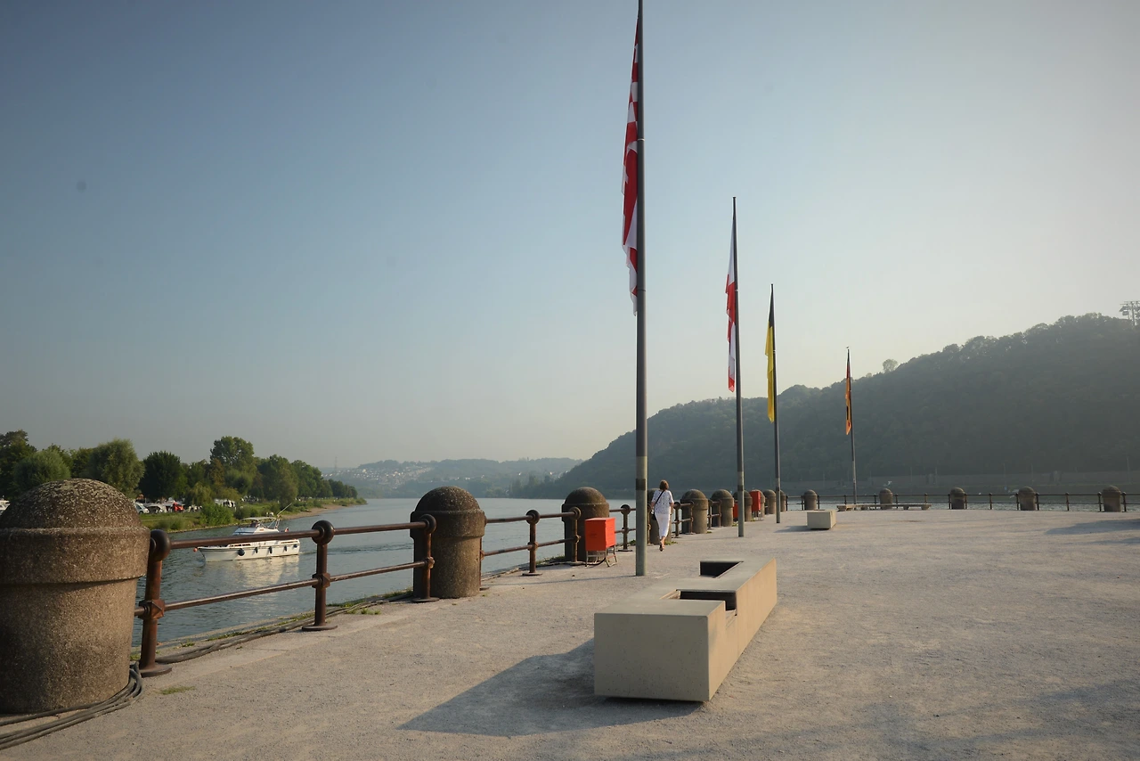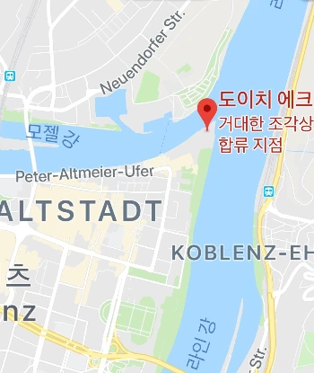 남동쪽으로부터 굽이굽이 흘러온 모젤 강이 도이체스 에크Deutsches Eck라고 하는 이 지점에서 라인 강과 합류한다. 어찌 보면 모젤 강이 소멸하는 지점이기도 하다. 근처에는 독일을 통일한 초대 황제 빌헬름 1세 기마상이 있다. 무인이자 프로이센의 왕이었던 그는 프로이센-프랑스 전쟁에서 승리하고 1871년에 독일의 황제가 되었다. 건너편에 있는 성은 유럽의 주요 요새 중 하나였다고 한다. 도이치 에크에서 성까지 케이블카로 갈 수도 있다.