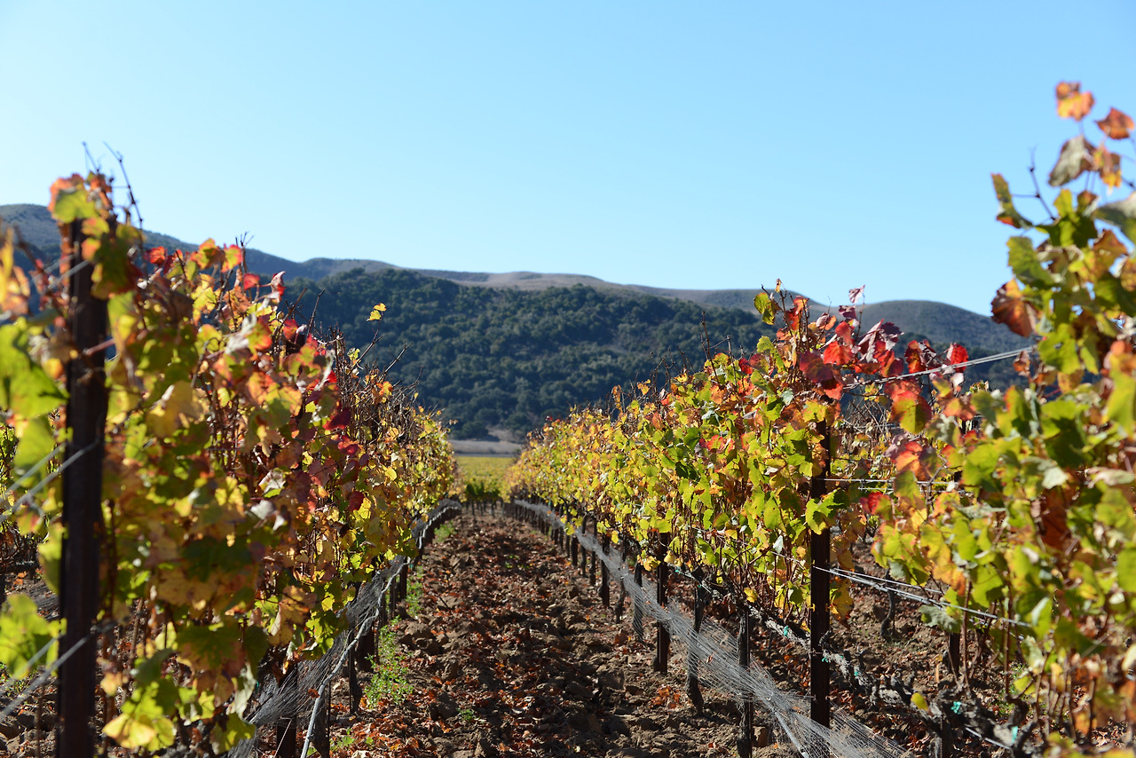 그래서 이번 여행에서는 와인을 딱 한 병만 사리라 결심을 하고 왔건만 첫 번째 놀이터에서부터 6 가지를 시음하고 알코올도 무지막지한 14%짜리로 피노 누아 한 병을 사버렸다. 그런 다음 30분 거리의 산타 리타 힐스 Sta. Rita Hills에 있는 샌포드 Sanford 와이너리로 갔다. 기온은 25도가 넘었지만 포도밭은 수확이 다 끝난 상태였고 가을 색을 입고 있었다.