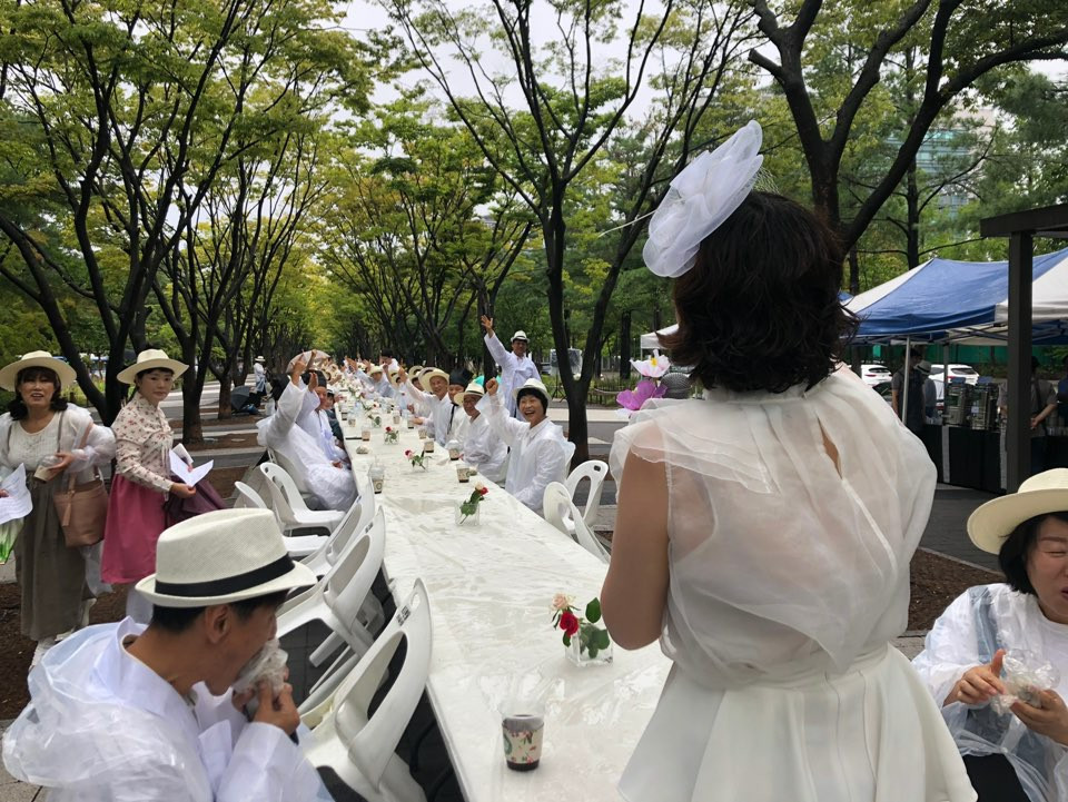밤부터 비가 내렸지만, 무조건 새벽 5시에 시청앞에 백개의 테이블을 깔았다. 새벽 5시부터 잠시 빌린 정토회 법당에서는 1000개의 주먹밥을 만들기 위한 밥솥이 끓기 시작하고 요리사 두 분과 정토회 도반들과 유성구청직원들이 함께 자원봉사에 나서서 주먹밥을 만들었다. 임교수님 부부의 장미꽃 센터피스가 올려지고, 후원해주신 에떼 에스프레소 커피부스가 만들어졌다. 그리고 마지막으로 전자첼로와 판소리 앙상블 공연을 위해 이상진대표의 공간문화기획팀의 무대 준비가 이어졌다.