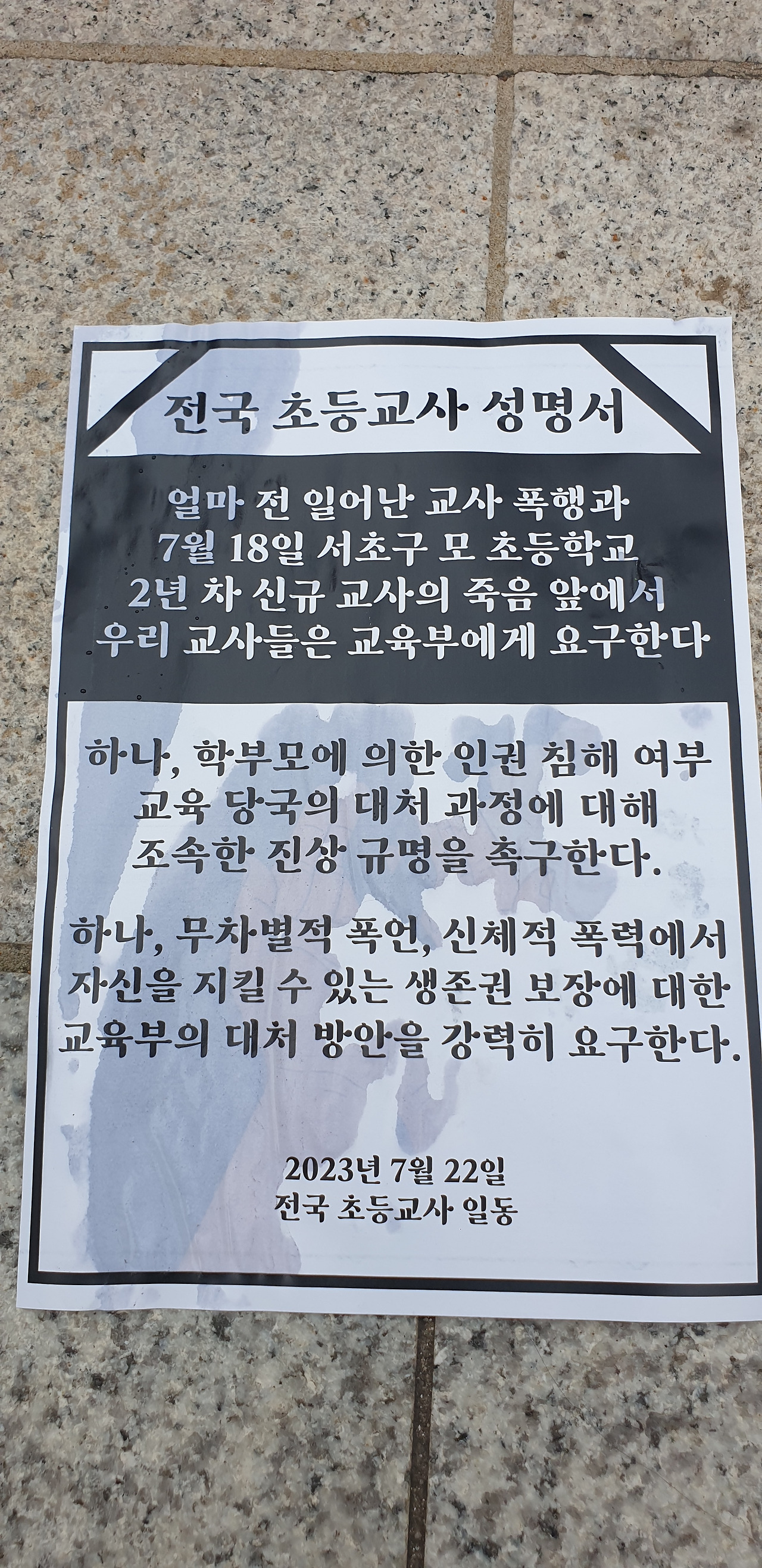 서이초의 어린 신규교사가 교실에서 자살을 선택하기까지 교감과 교장은 무엇을 하고 있었는지에 대해서는 왜 함구하고 있는가? 교육부 장관은 왜 어린 교사를 죽음으로 몰아넣은 교육현장에 대한 책임은 통감하지 않고 경찰에 철저한 조사를 촉구하고 있는가? 그것이 이 나라 교육의 수장으로서 합당하고 정당한 일인가? 교육부장관의 할 일을 다하고 있는 것인가? 교육정책이란 사고 이전에 합리적인 교육 시스템을 만드는 일이 아니던가?