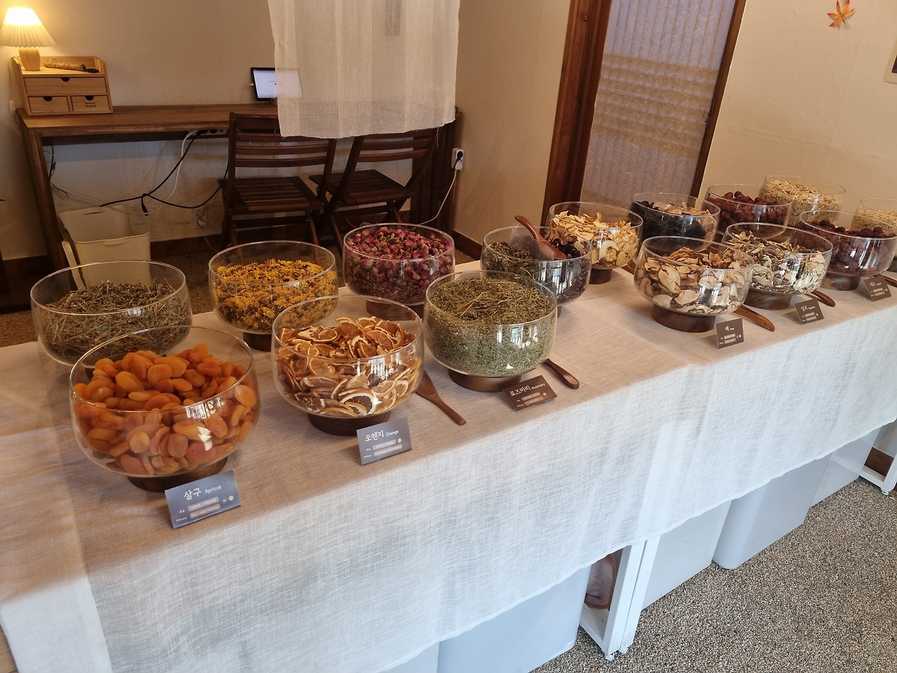 그렇게 예약시간에 맞추어 방문한 '전주일몽'. 한옥을 개조해 만든 체험 공간에서는 정갈함이 느껴졌다. 테이블에 놓여있는 대추, 숙지황, 편강, 배, 사과, 살구등이 우리를 반겨주었다. 막걸리에 넣는 재료들로 보였다.