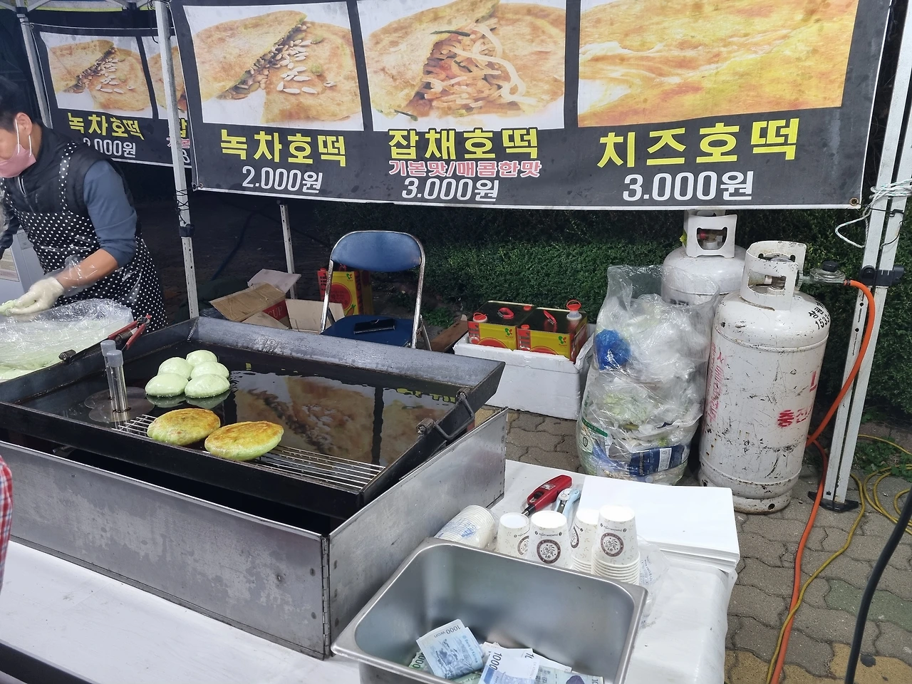 2,000원짜리 녹차호떡도 하나 먹었다. 녹차가루를 넣었는지 반죽이 초록색을 띄었는데 녹차 맛은 나지 않았다. 스테인리스 통에 현금들이 들어있고, 사장님도 손님들도 알아서 돈을 넣고 돈을 꺼내 갔다. 이렇게 자율적으로 계산하는 방식을 오랜만에 봐서 감회가 새로웠다.
