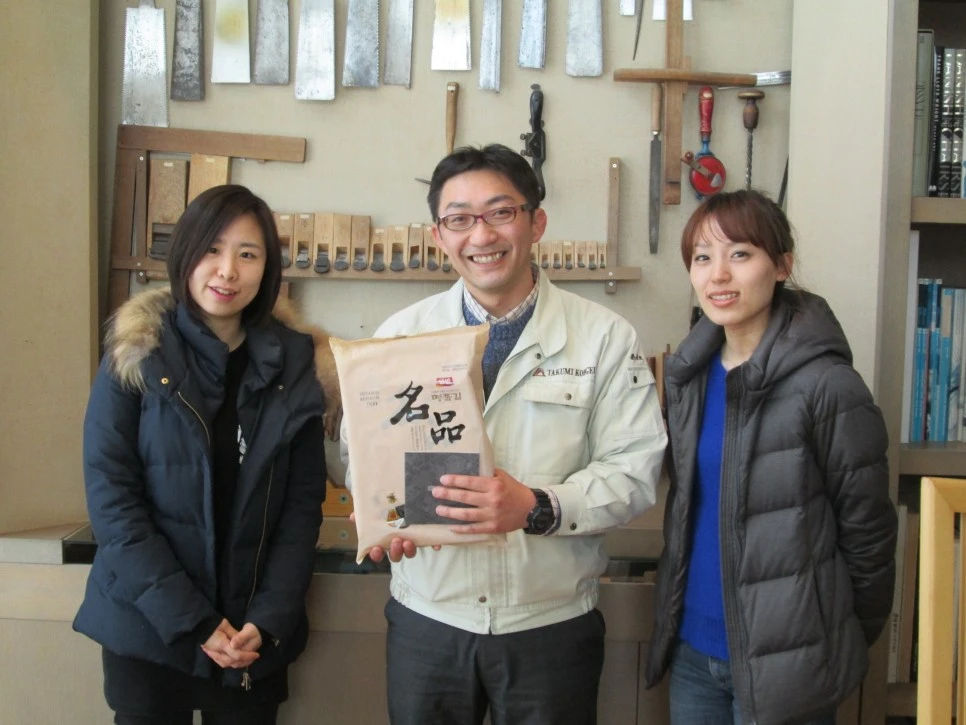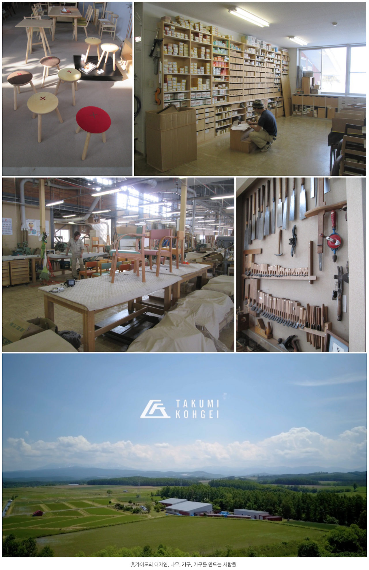 타쿠미 공예는 일본 홋카이도의 작은 소도시, 아사히카와에 위치한 목가구 회사인데요. 아사히카와는 일본의 대표 가구 산지로, 가구 회사가 많이 밀집해 있는 지역입니다. 저는 그중 한 곳인 '칸디하우스'라는 가구회사에서 3년간 일했습니다. 2014년, 퇴사를 앞두고, 공장 견학을 다녔는데요, 그중 한 곳이 타쿠미 공예였습니다.