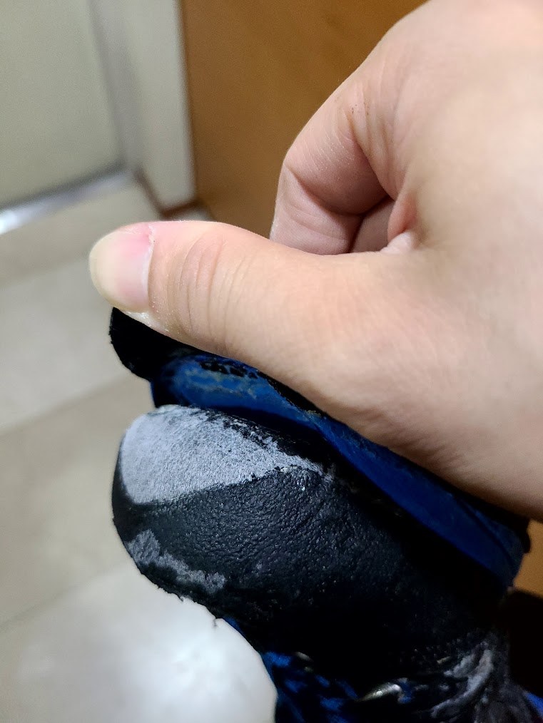 그렇다면 뭐 어쩌겠는가, 알아서 해야지. 나는 일단 산에서 밑창이 또 떨어져도 묶어서 응급조치할 수 있도록 신발끈을 배낭에 챙겨넣은 다음 작업을 진행했다. 과정은 단순했다. 접착면을 줄로 좀 갈아낸 다음 다이소에서 산 V-tech 신발 접착제를 양쪽에 도포하고 한나절 말린 뒤에 헤어드라이어로 가열하고 접착하고 고무 띠로 단단히 조여서 나흘 쯤 정착시켰을 뿐이다.