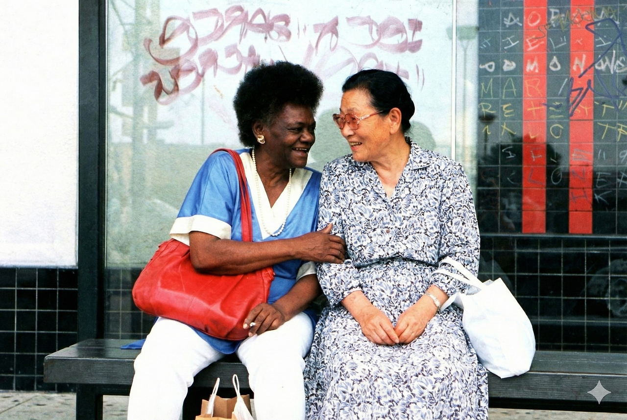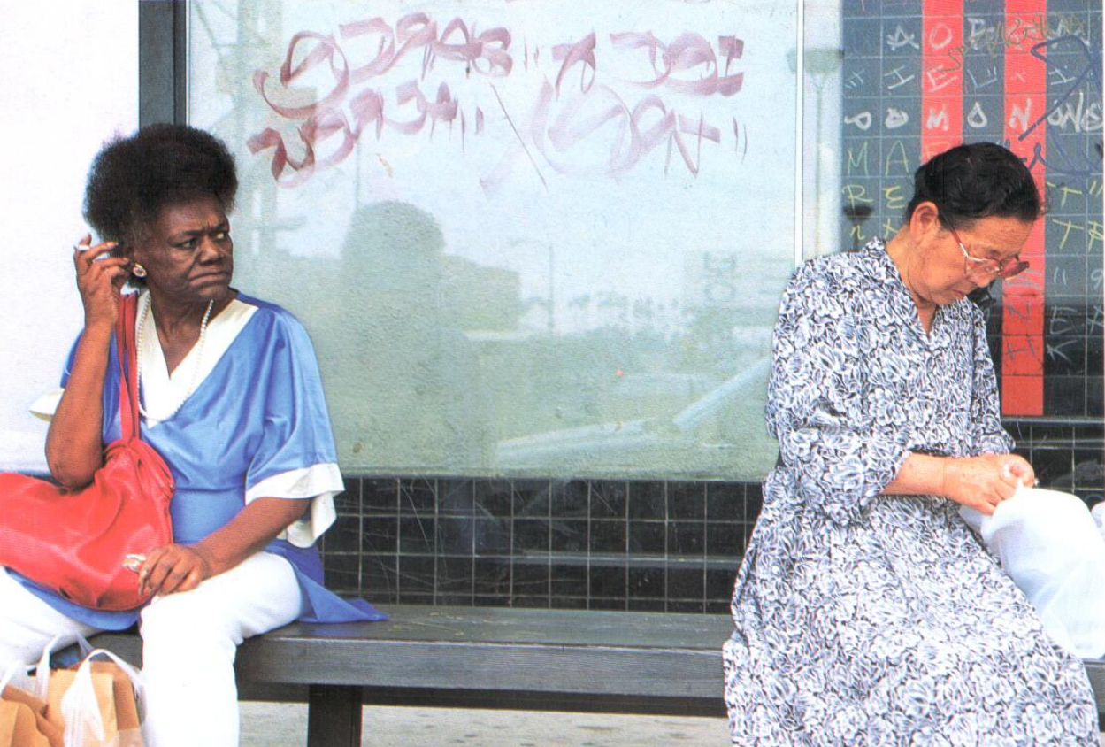 사진 속 벤치를 다시 봅니다. 흑인 여성과 한국인 할머니가 나란히 앉아 있지만, 물리적 거리만큼이나 심리적 경계가 뚜렷합니다. 서로 다른 곳을 응시하는 시선과 벤치 양 끝을 차지한 거리감은 당시 우리 교민 사회와 흑인 커뮤니티 사이에 놓여 있던 보이지 않는 벽을 대변하는 듯했습니다. 저는 뷰파인더를 통해 그 ‘단절된 공존’을 포착했고, 그것이 사진가로서 제가 할 수 있는 유일한 일이었습니다.