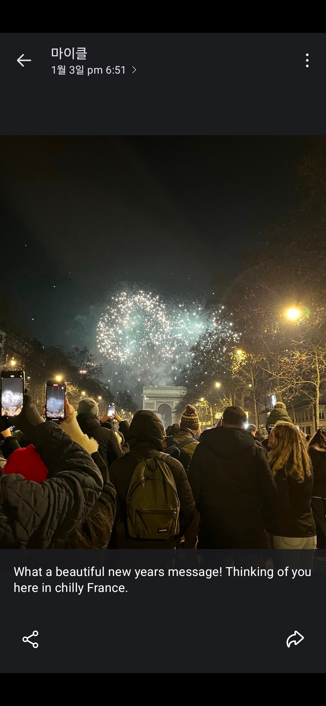 겨울 저녁 공기가 차분히 가라앉을 무렵, 손바닥 위 액정으로 먼 곳의 빛이 배달되었습니다. 화면이 밝아지자 파리의 새해를 알리는 풍경이 나타납니다. 개선문의 당당한 실루엣 위로 화려한 불꽃이 흩어지고, 그 아래에는 축제를 즐기려는 인파가 가득합니다. 사진을 보낸 친구 마이클은 그 환호의 현장에서 짧은 인사를 덧붙였습니다.