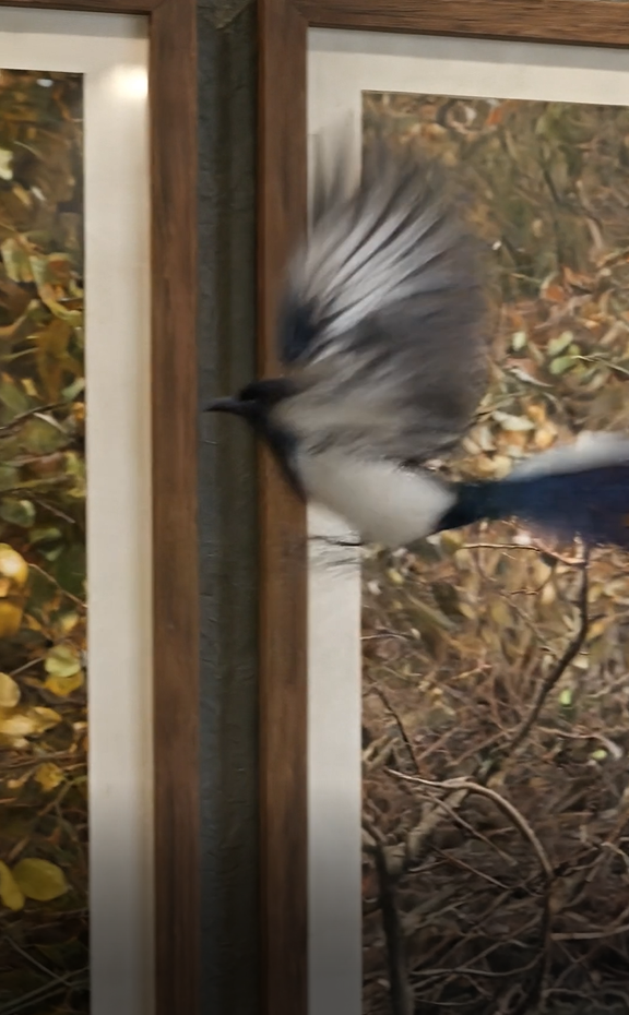 지난 늦가을 오후, 창밖 감나무에 까치 한 마리가 날아들었습니다. 그 찰나의 마주침을 사진으로 기록하고, 다시 AI를 통해 하나의 생명력 있는 움직임으로 되살려냈습니다. 벽면을 채운 두 폭의 액자 사이, 그 텅 빈 허공에는 우리가 미처 기록하지 못한 시간이 흐르고 있습니다. 찰나를 잘라내어 영원히 가두려는 인간의 충동은 액자라는 견고한 프레임을 만들었지만, 역설적으로 그 프레임은 생동하는 삶의 연속성을 단절시키는 안온한 감옥이 되기도 합니다.