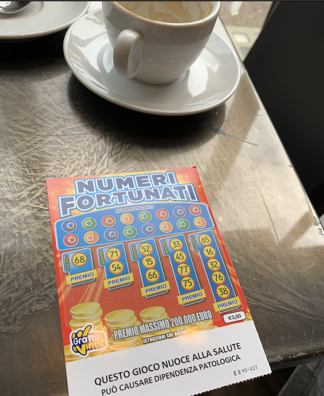 이탈리아 사람들은 우리가 로또 이전에 주로 했던 동전으로 긁는 복권의 조상님을 아직까지도 진심으로 즐기고 있다. 특히나 항상 커피와 함께 신문을 보며 열심히 복권을 긁는 사람들의 모습들을 보고 있으면 피식 저절로 웃음이 나곤 한다.