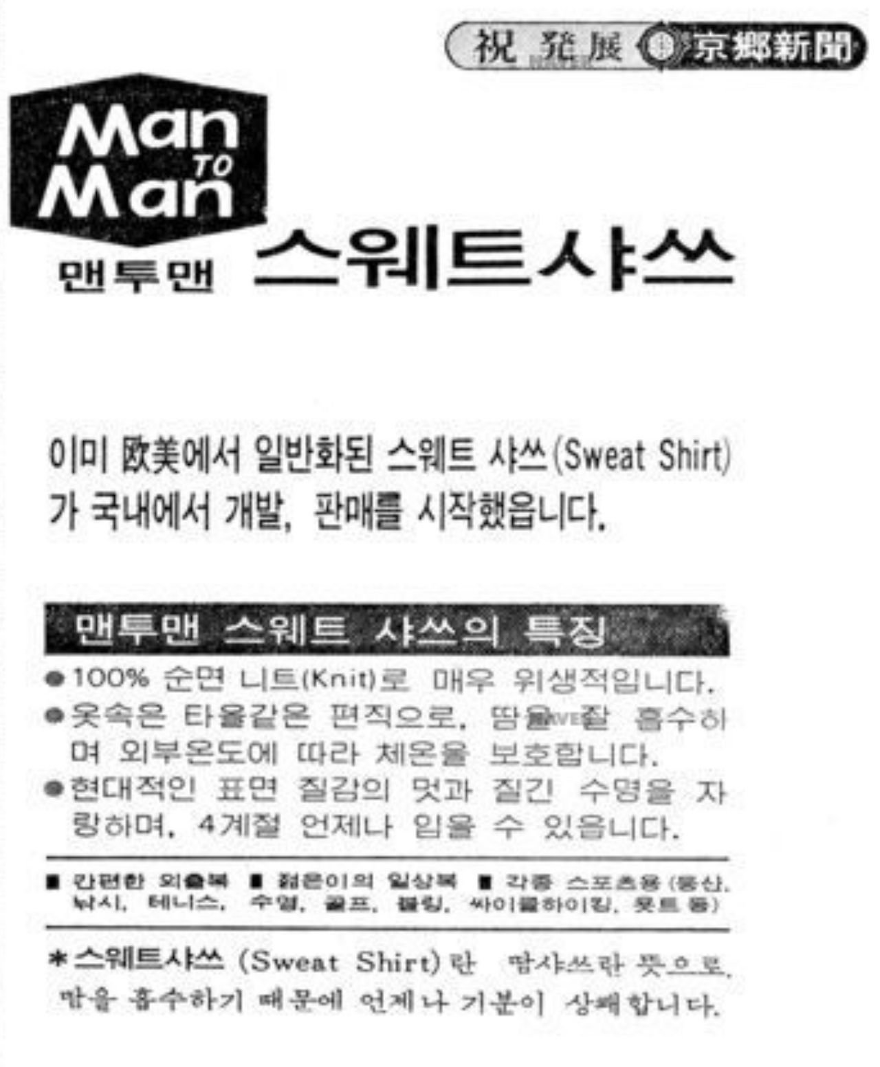 여담으로 한국에서는 왜 스웻셔츠가 맨투맨이라 불리울까? 이는 한 인터넷 유저의 노력에 의해 2019년 처음 밝혀졌다. 처음으로 맨투맨이라는 단어가 표기 된 것은 1974년 7월 27일 경향신문에 성도섬유에서 ‘맨투맨 스웨트샤쓰’라고 광고를 내며 사용한 것이며 이것을 시초로 보고있다. 이때 맨투맨이라는 것이 호치키스, 봉고, 포스트잇과 같이 하나의 고유명사로 자리잡았을 거라는 것이 추측이다.