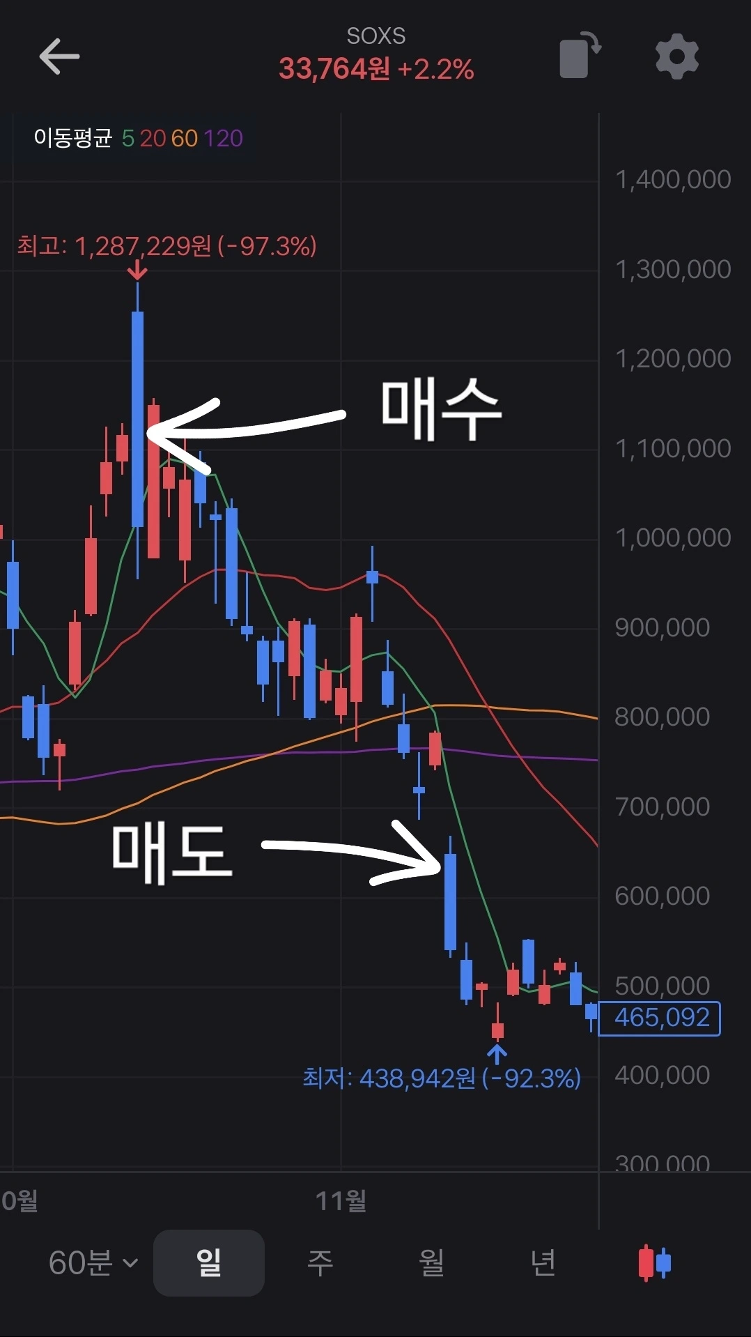 나 역시도 이번만큼은 각오를 단단히 하고 마지막으로 모든 돈을 끌어모았고 오토바이 판 돈까지 3200만 원을 모아서 미국 반도체 지수 하락 3배를 추종하는 인버스 주식 SOXS를 주당 1,115,000원에 28주 매수했어. 매수한 다음날 조금 오르는듯하더니 그다음 주에는 80만 원대까지 떨어지더라고 잠시 이러다가 오르겠지라고 생각하는 데... 11월 10일 새벽에 곤두박질을 치는데 말이야 그날 하루만 30% 넘게 떨어지더라고! 기가 막혀요~