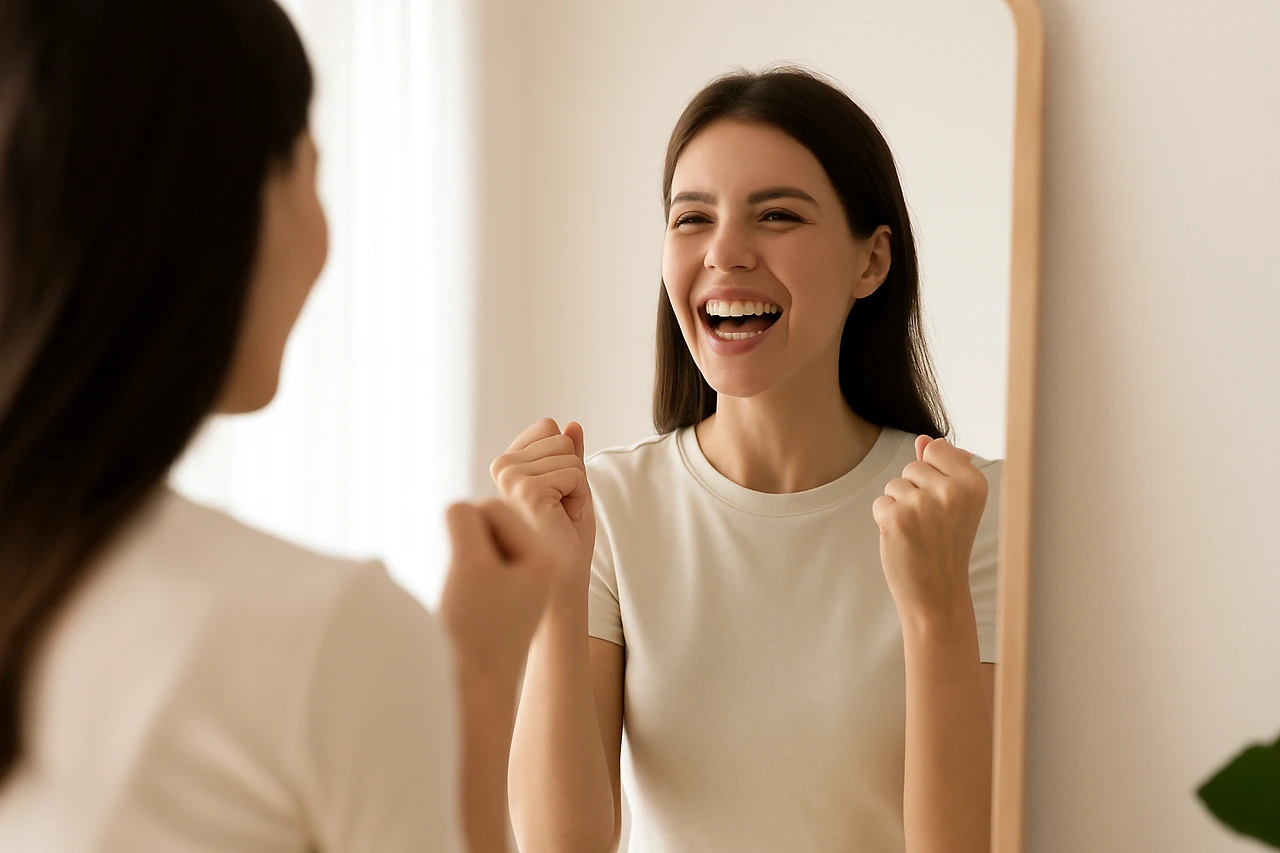 “방금 쓴 글을 가로형 이미지로 만들어줘. 20대 여성이 거울을 보며 두 주먹을 불끈 쥐고 환하게 웃는 장면으로!”