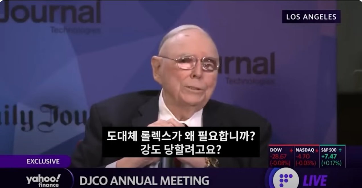 그러던 어느 날 마법처럼 유튜브 로직이 찰스 멍거의 영상을 내게 인도했다. DJCO ANNUAL MEETING에서 인터뷰하는 영상이었는데, 내 뇌리에 박힌 말은 "당신이 롤렉스가 왜 필요한가?"라는 멘트였다. 그 뒤로 이어지는 말들도 허세적 소비에 대한 성찰이었는데, 사람마다 받아들이는 부분이 다를 순 있겠으나 내게는 무엇보다 내 소비를 돌아보게 하는 결정적인 말이었다.