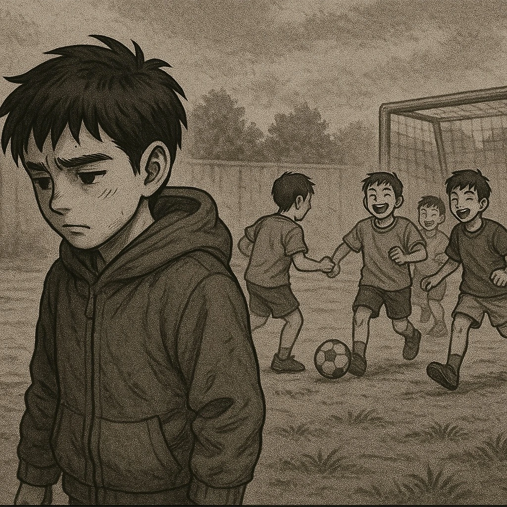 공을 차며 웃는 아이들을 구석에서 바라보다가, 등을 돌려 걸어갔다.