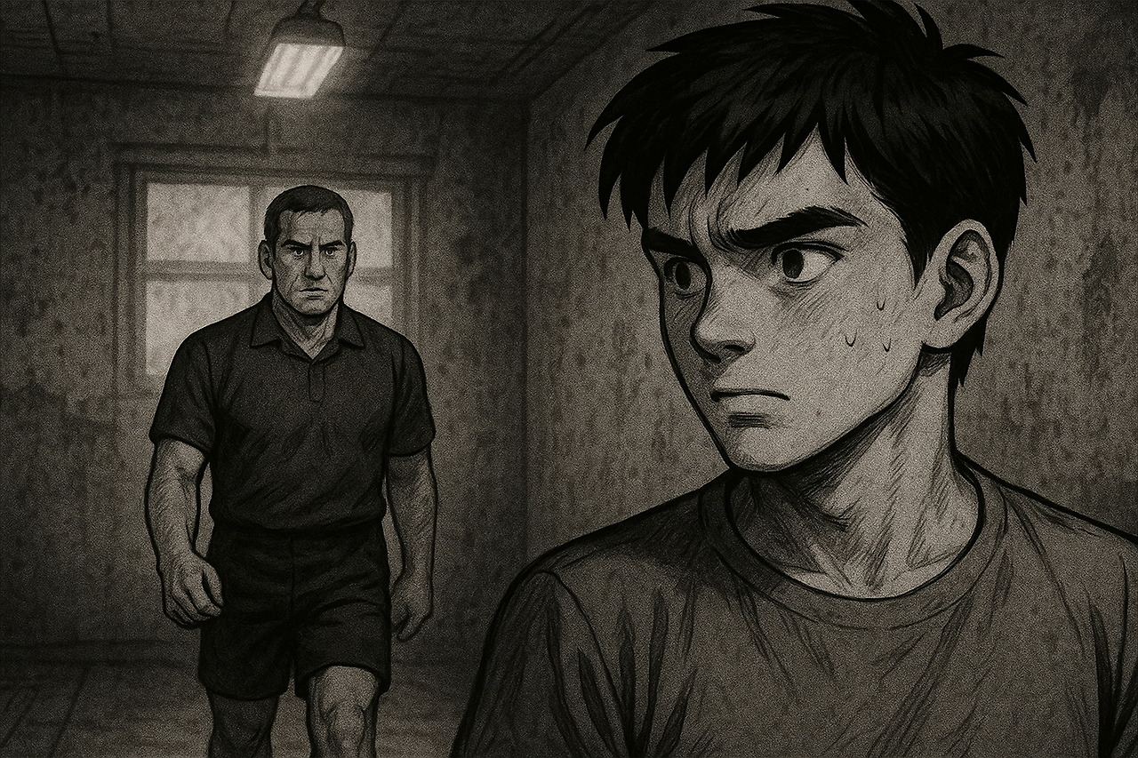 낡은 조명이 깜빡이며 빛과 어둠을 교차시키는 그 자리에서, 40대 후반의 관장이 서 있었다.