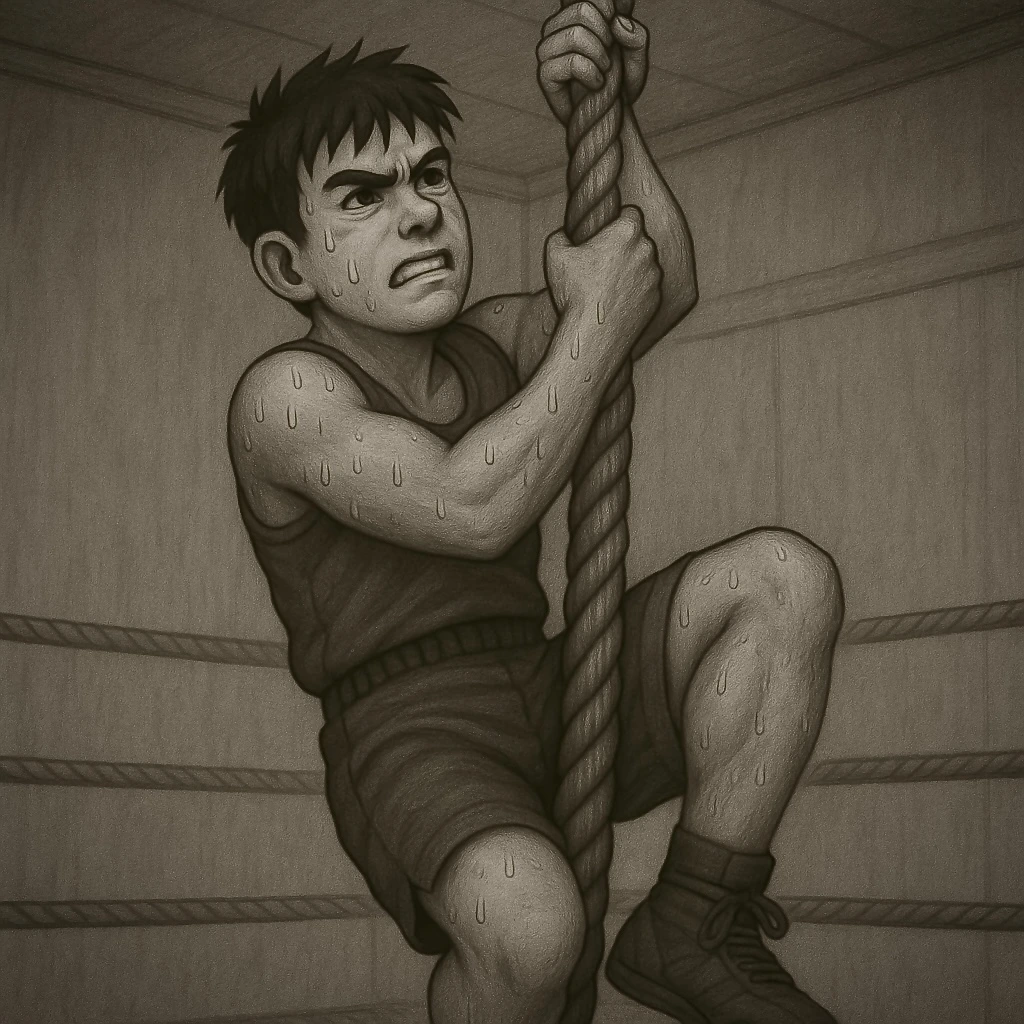 체육관 안, 높게 매달린 밧줄.