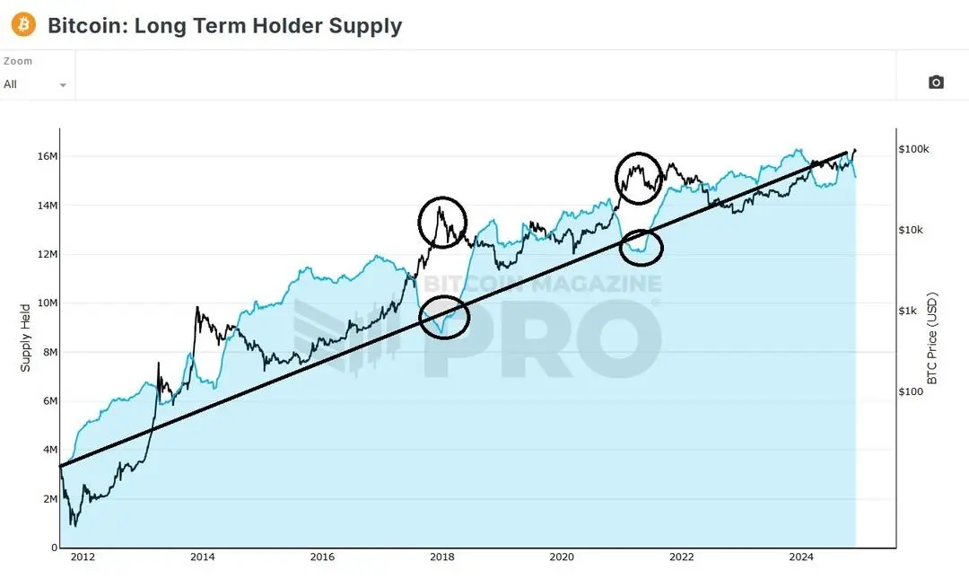 비트코인의 가격 상승에는 *장기 보유자(Long-Term Holder)와 단기 보유자(Short-Term Holder) 간의 수급 변화가 중요한 역할을 합니다. 아래는 비트코인 가격과 장기 보유자 비율 간의 상관관계를 나타낸 패턴입니다.
