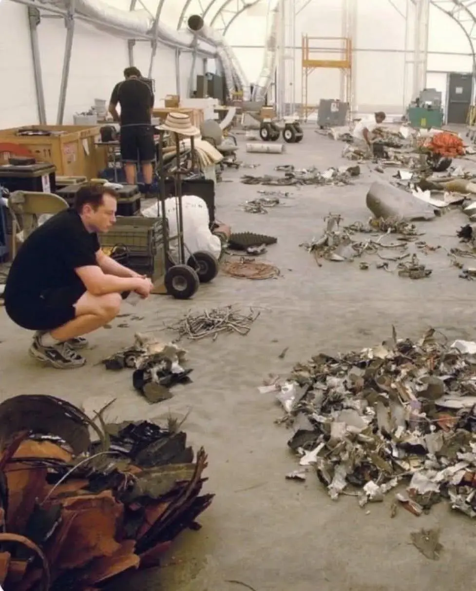 이 사진은 스페이스X 초기 Falcon 1 로켓 개발 실패 후, 일론 머스크가 잔해를 앞에 두고 깊은 고민에 빠진 모습을 담은 것이다. 스페이스X는 초기 발사 실패를 반복.