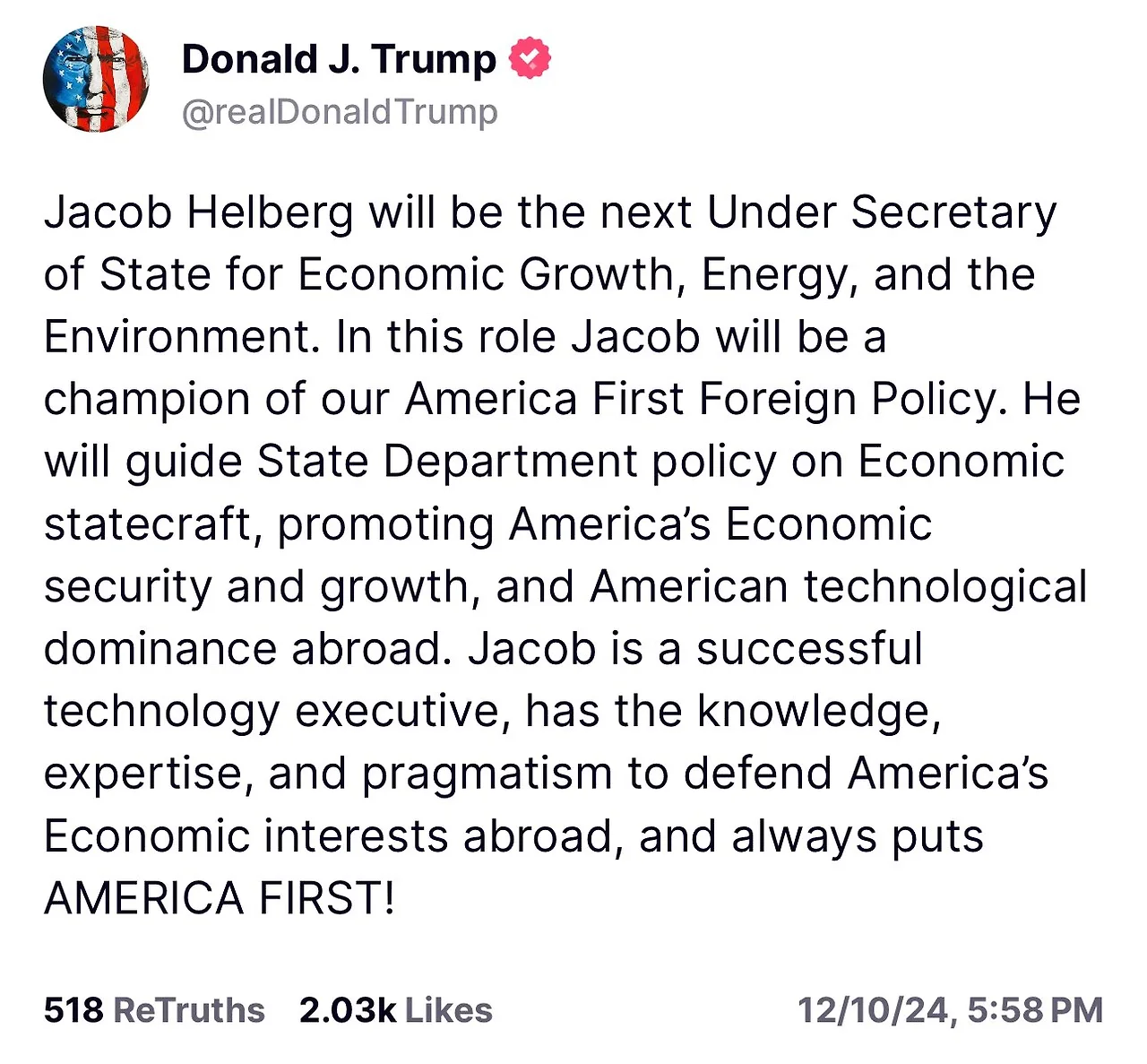 이번 임명을 통해 헬버그는 미국 외교 정책의 경제적 측면을 강화하고, 기술과 에너지 안보 분야에서의 국가 전략을 이끌게 됩니다. 특히 "America First" 정책을 기반으로, 경제 성장과 미국 기술의 글로벌 우위를 보장하는 데 중추적인 역할을 할 것으로 기대됩니다.
