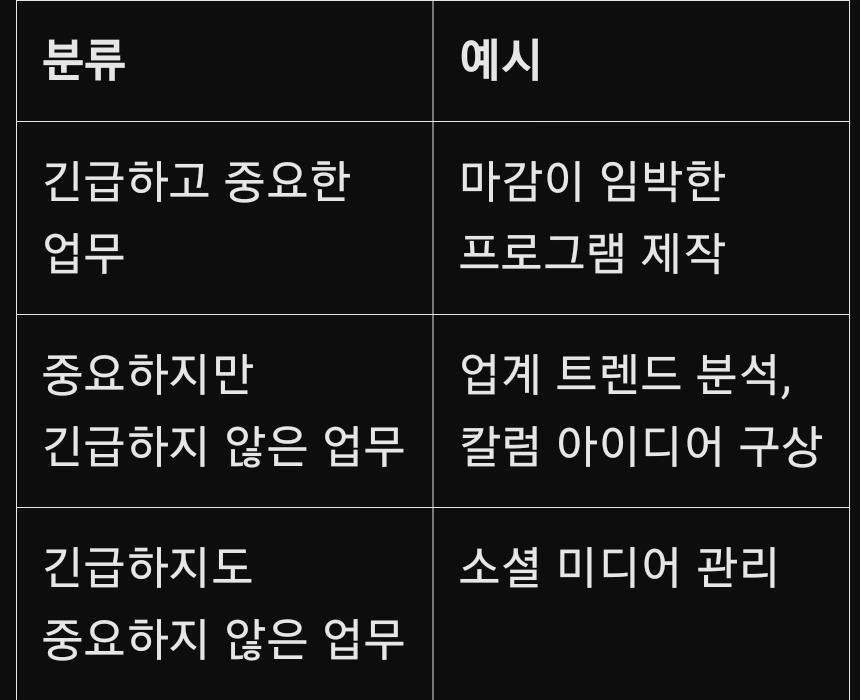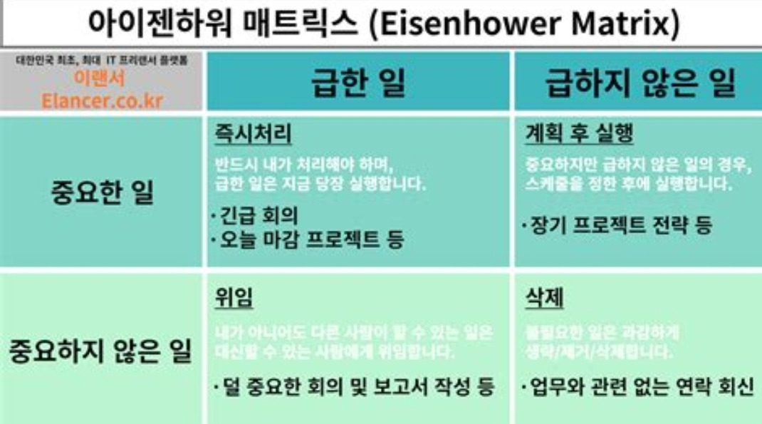 중요도와 긴급성을 기준으로 업무의 우선순위를 정하세요. 아이젠하워 매트릭스는 이를 위한 훌륭한 도구입니다.