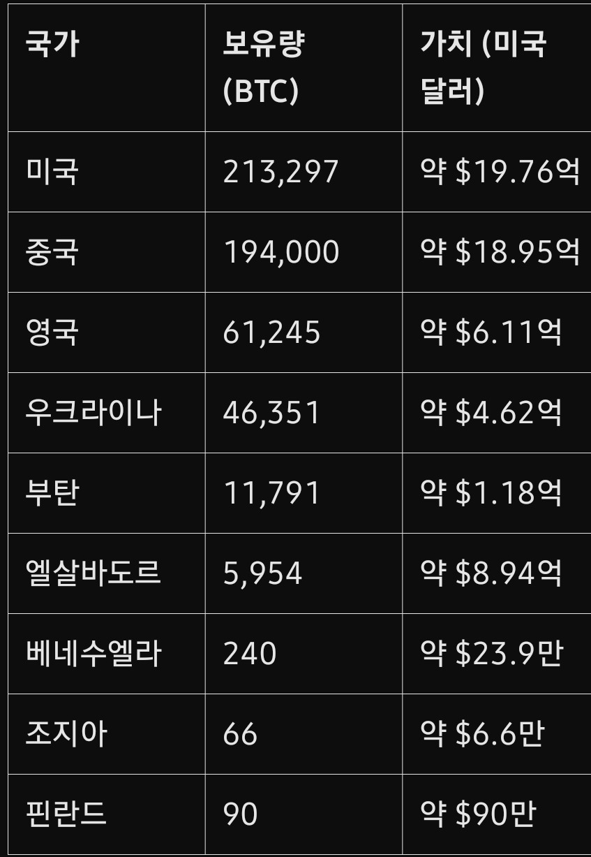 부탄: 약 12,206 BTC를 보유하며, 비트코인을 국가 전략 자산으로 활용하고 있습니다.