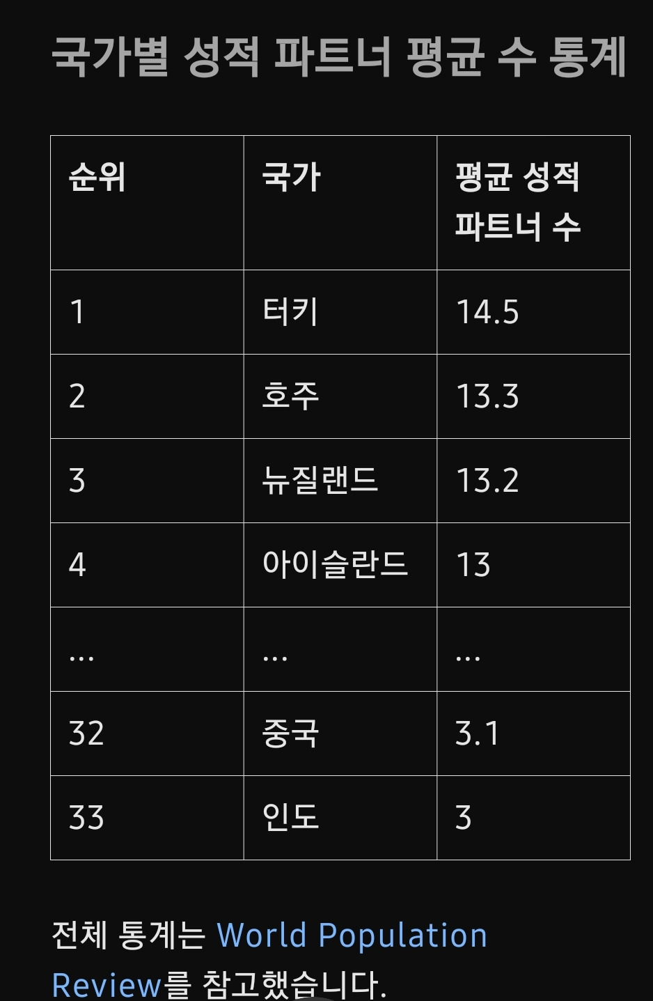 중국(3.1명)과 인도(3명)는 가장 낮은 평균을 기록했습니다. 이들 국가는 전통적인 가족 중심의 가치관과 사회적 규범이 강하게 자리 잡고 있으며, 성적 행동에 대해 보다 보수적인 태도를 가지고 있습니다. 이러한 점은 낮은 평균의 주요 원인으로 작용했을 가능성이 큽니다.