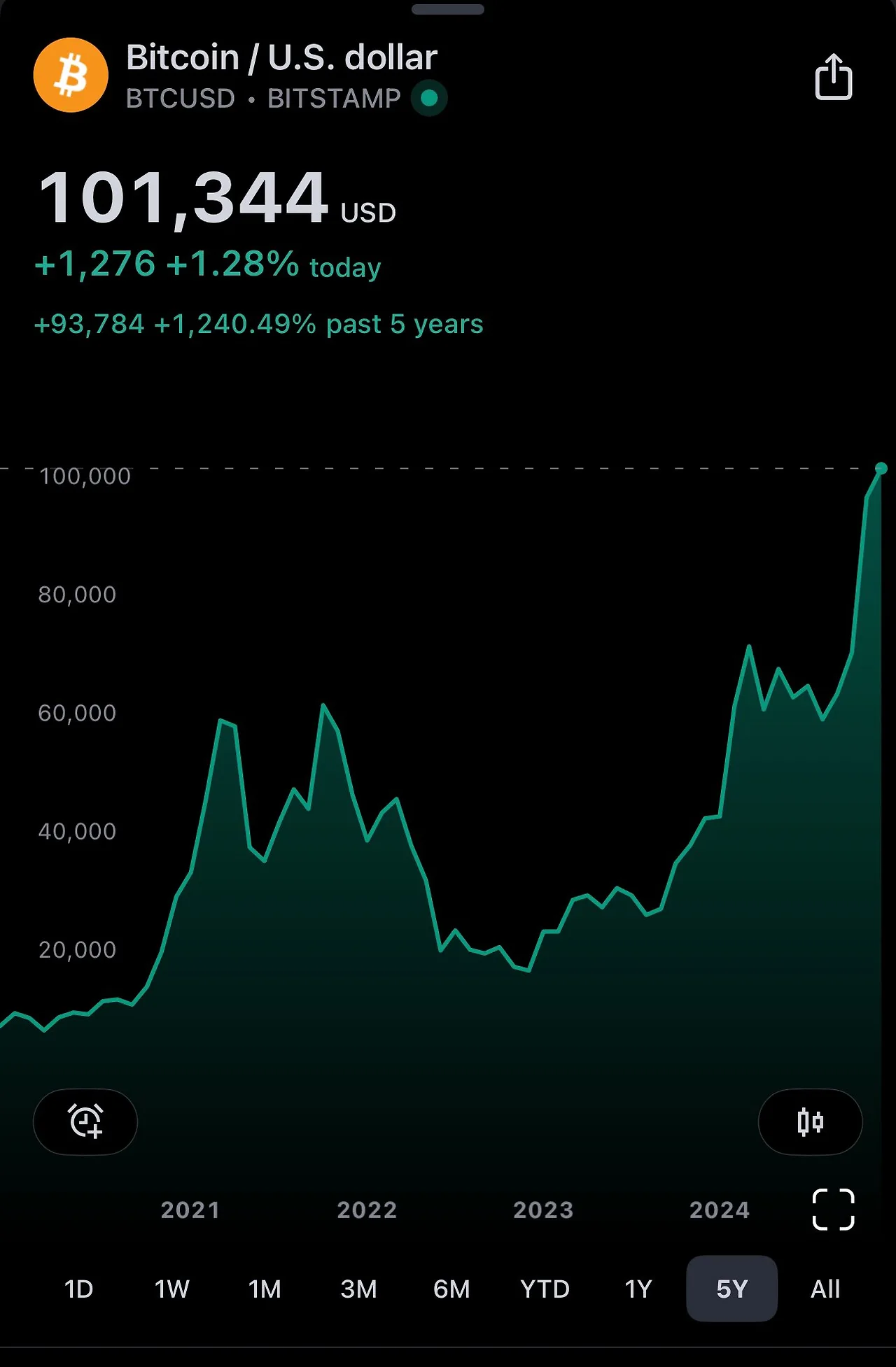 비트코인이 역사상 처음으로 10만 달러를 돌파하며 현재 101,344달러에 거래되고 있습니다. 이는 디지털 자산 시장의 새로운 전환점으로 평가되며, 글로벌 금융 시장과 암호화폐 생태계에 중대한 영향을 미치고 있습니다.