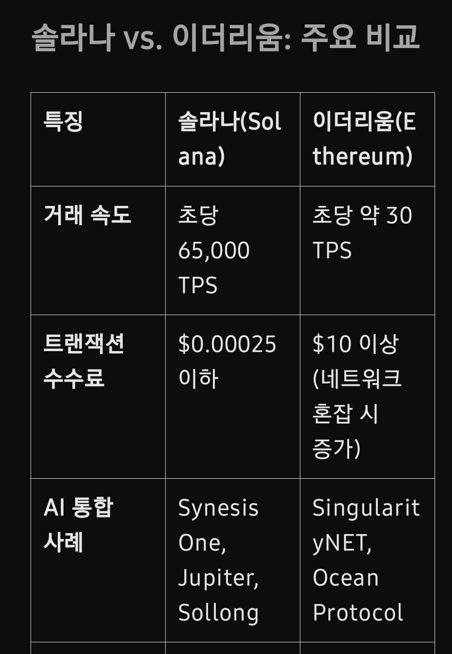 솔라나와 이더리움은 각기 다른 강점과 약점을 가진 블록체인 플랫폼으로, AI와의 결합을 통해 혁신을 선도하고 있습니다. 솔라나의 낮은 비용과 빠른 속도는 AI 기반 실시간 응용 프로그램에 적합하며, 이더리움은 광범위한 생태계와 높은 안정성으로 AI 기술을 지원합니다.