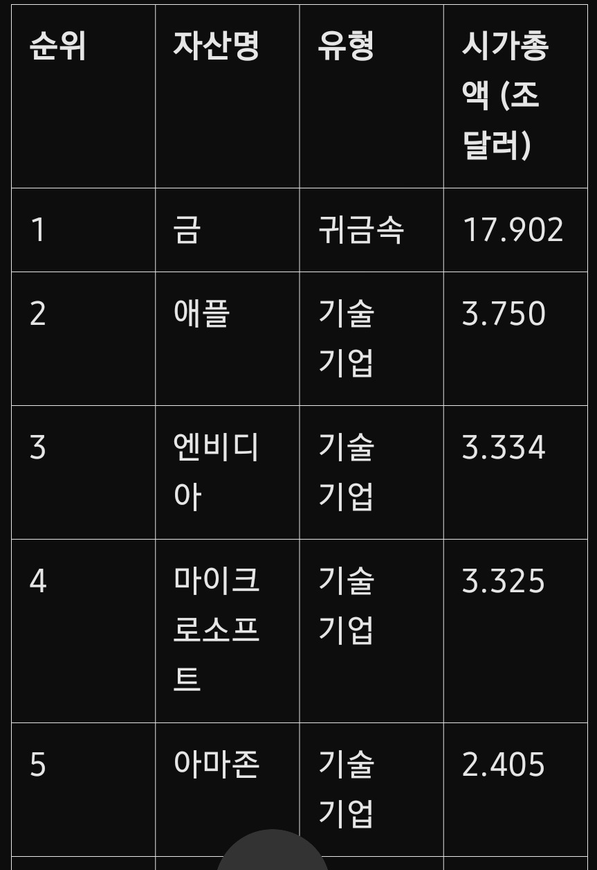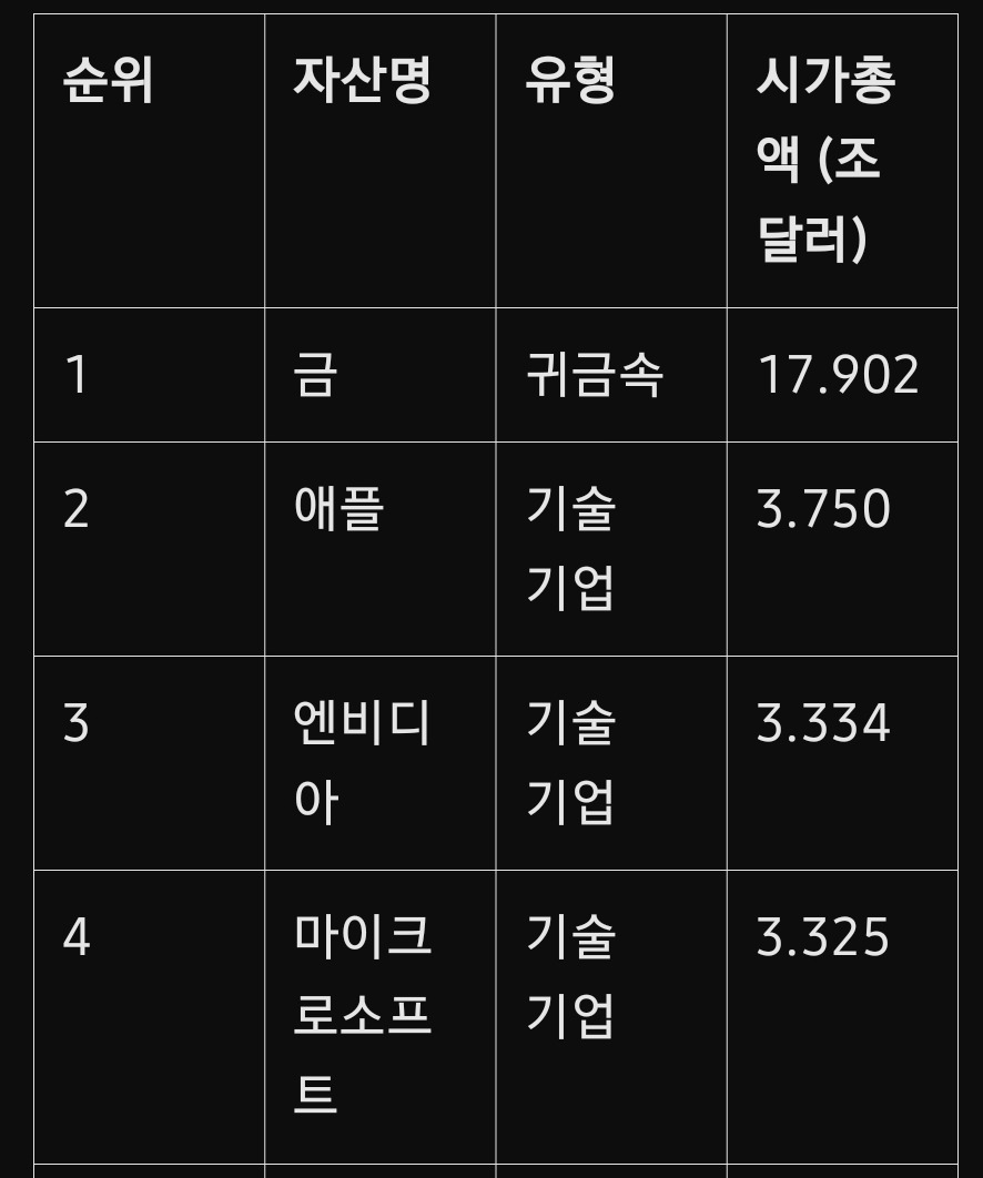 금과 은은 여전히 높은 시가총액으로 글로벌 경제의 불확실성을 반영하며, 안정적인 가치 저장 수단으로서 자리 잡고 있습니다. 금은 17.902조 달러로 1위를 차지하며, 경제 위기나 인플레이션 시기에 강력한 투자처로 기능하고 있습니다.