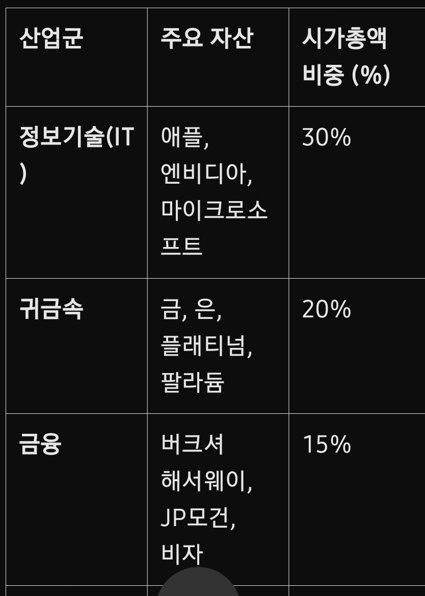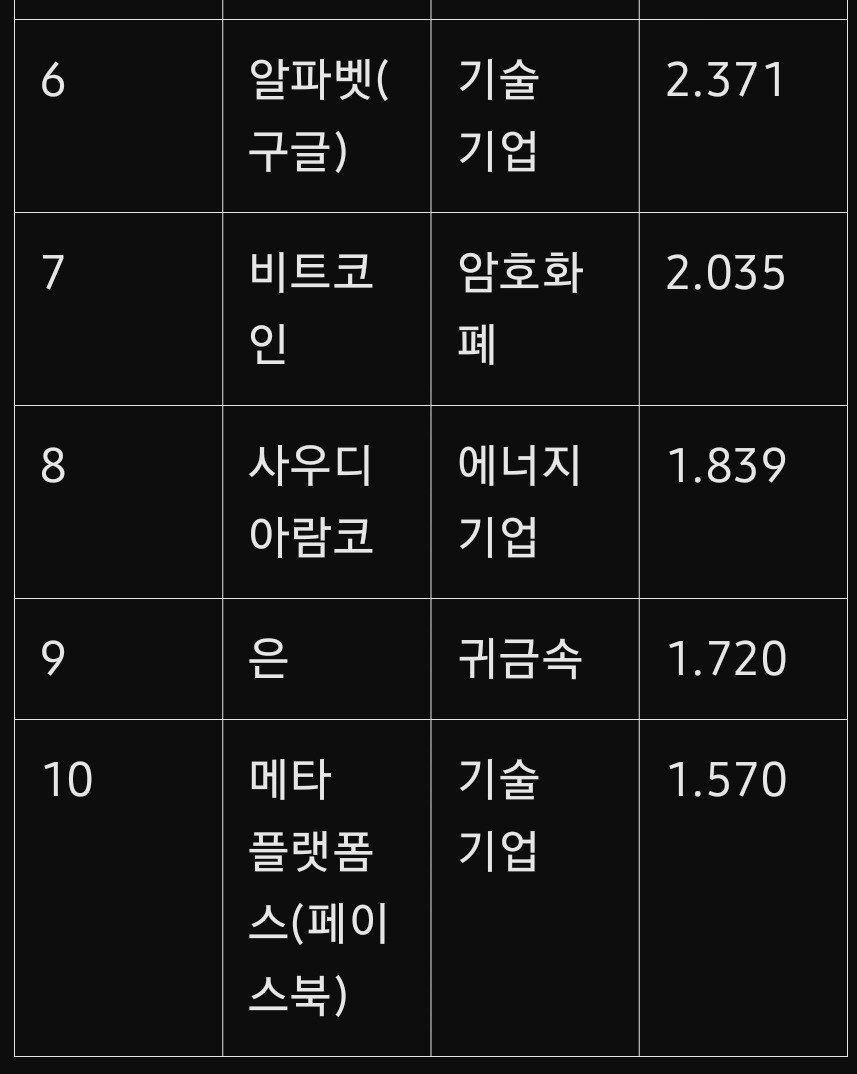 상위 10대 자산 중 6개는 기술 기업이 차지하고 있으며, 애플(2위), 엔비디아(3위), 마이크로소프트(4위) 등이 대표적입니다. 이러한 기업들은 AI, 클라우드 컴퓨팅, 반도체 등 첨단 기술 산업을 이끌며 지속적인 성장세를 보이고 있습니다.