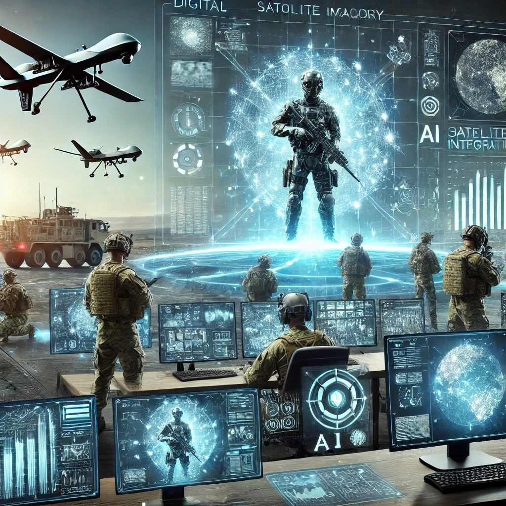 이미지 생성 프롬프트: 위성 이미지와 AI 분석 시스템을 통해 전장 데이터를 시각화하는 모습.