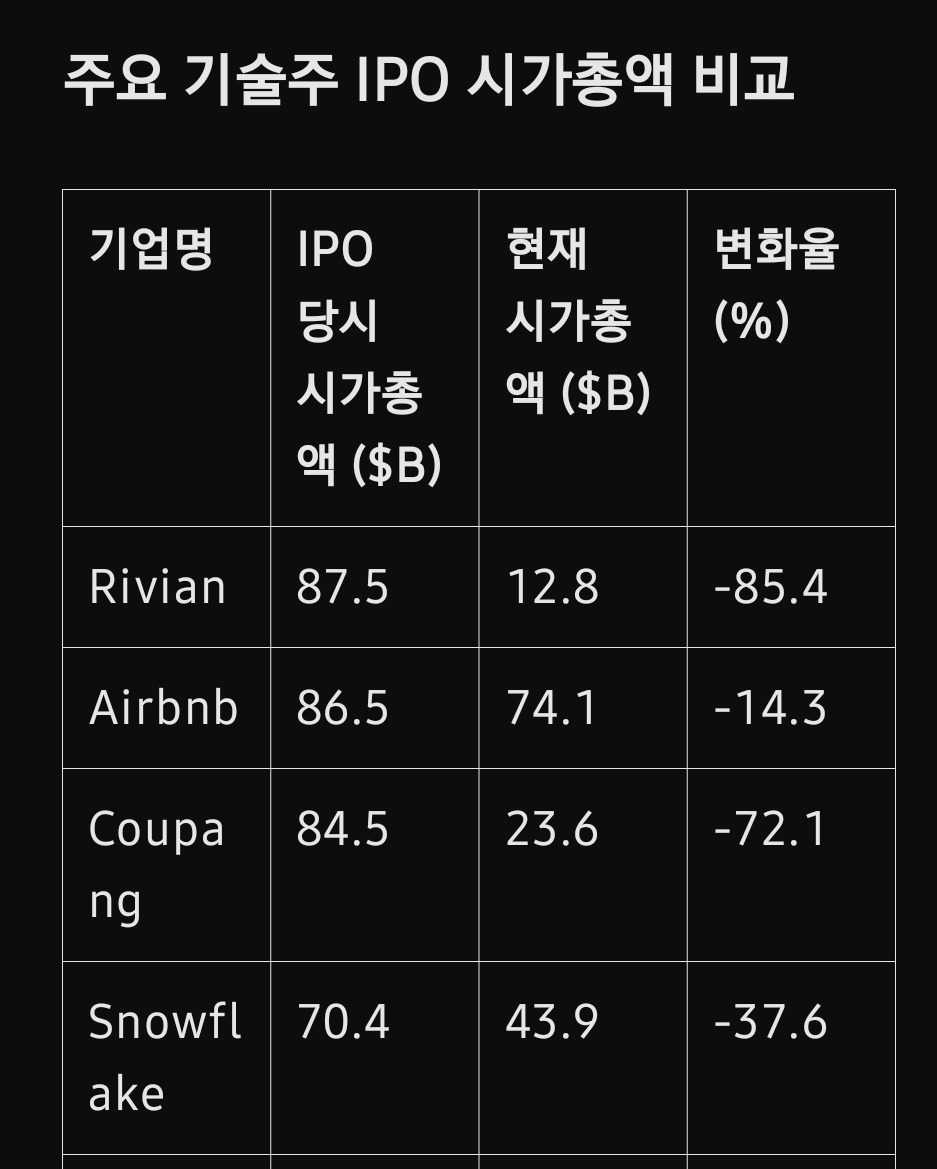 주요 기술주 IPO 시가총액 비교