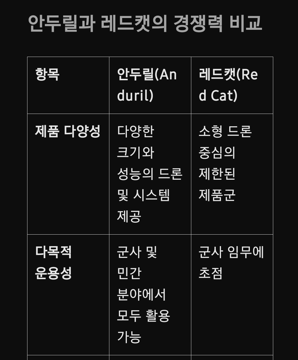 결론적으로, 안두릴은 기술력과 시장 확장성에서 경쟁력을 확보하며, 레드캣은 특정 니치 시장에서의 강점을 발휘하고 있습니다. 앞으로 두 기업이 경쟁하며 발전해 나갈 차세대 드론 시장의 동향에 주목할 필요가 있습니다.