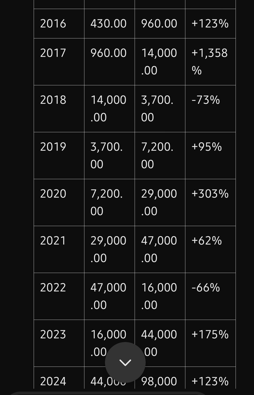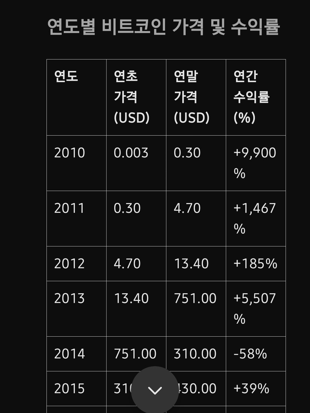 2022년 (-66%): 암호화폐 시장의 전반적인 침체와 글로벌 경제 불확실성으로 인해 큰 폭의 하락을 경험했습니다.