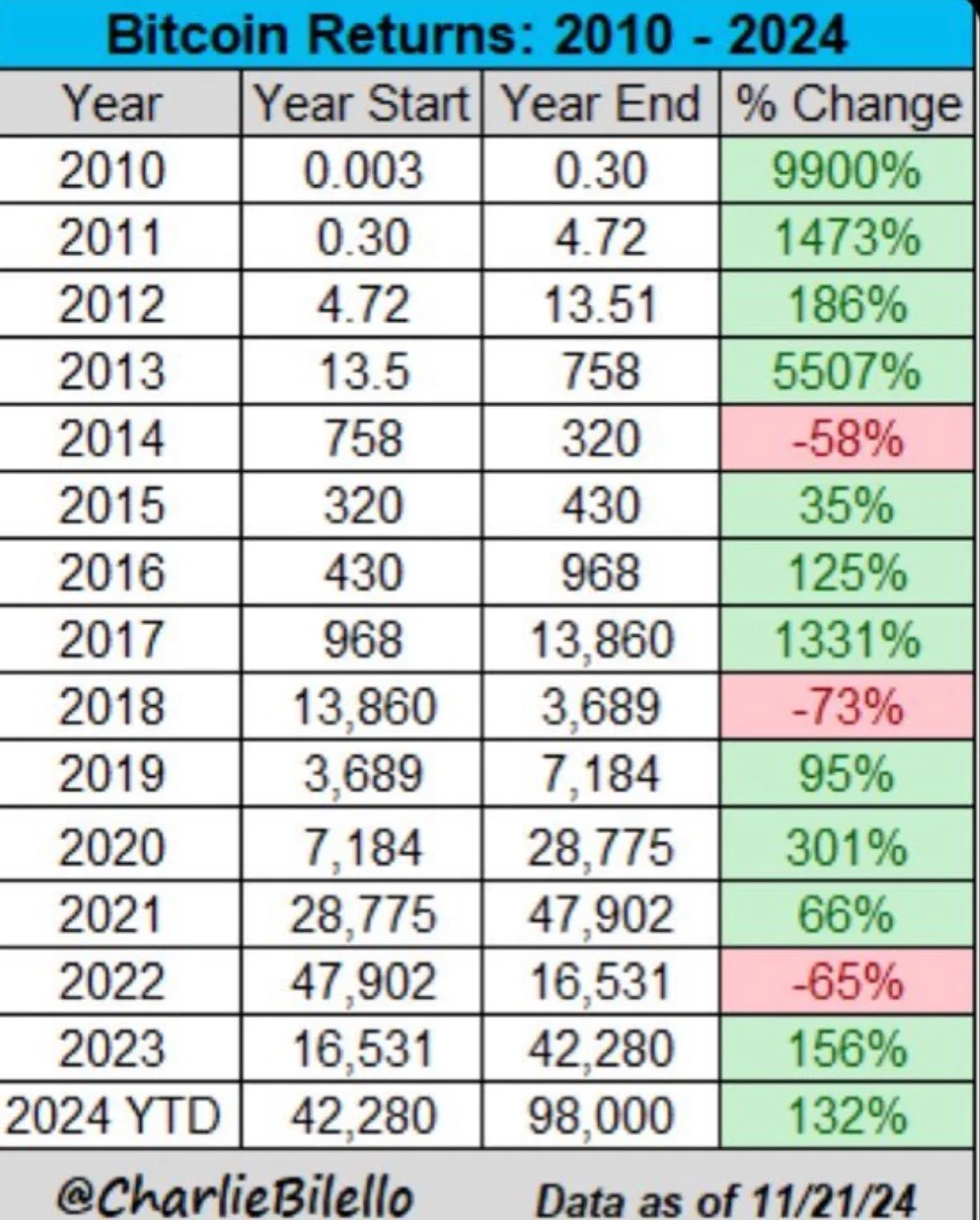 2010년: 비트코인은 0.003달러에서 0.30달러로 상승하며 무려 9,900%의 수익률을 기록했습니다. 이는 초기 투자자들에게 엄청난 수익을 안겨주었으며, 디지털 자산의 가능성을 입증한 해였습니다.