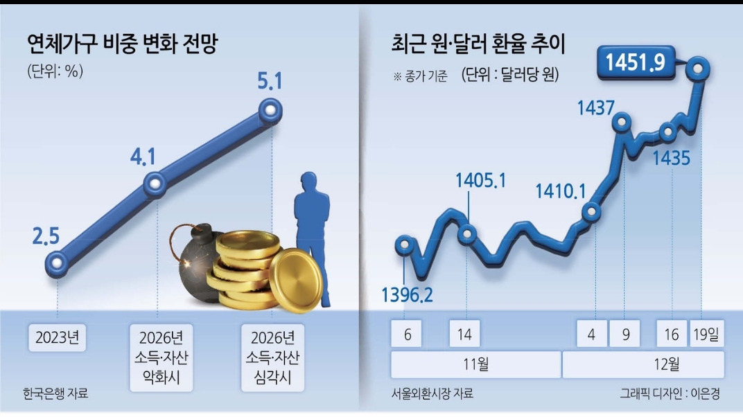 반면, 한국 경제는 수출 경쟁력 약화와 함께 내수 경기 침체, 가계부채 증가 등으로 원화 약세가 심화되고 있습니다.
