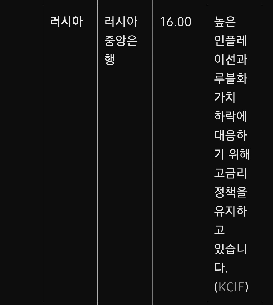 높은 인플레이션 억제와 루블화 가치 방어를 위해 극단적인 금리 정책을 시행 중입니다. 우크라이나 전쟁 이후 국제 경제제재와 에너지 가격 하락이 주요 요인입니다.