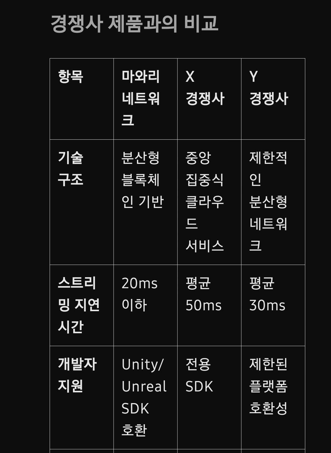 마와리는 경쟁사 대비 기술적 우위와 비용 효율성 면에서 뛰어나며, 특히 개발자 지원과 지연 시간 관리에서 강점을 보입니다.