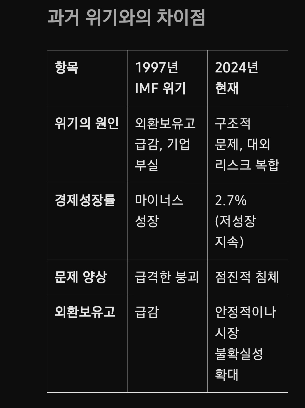 현재 대한민국은 경제, 사회, 국제적 리스크가 복합적으로 작용하며 과거 IMF 위기나 2008년 금융위기와는 다른 형태의 위기에 직면하고 있습니다. 이러한 위기는 단기적인 충격이 아닌 점진적인 구조적 침체로 이어지고 있어, 보다 근본적인 대책이 요구됩니다.