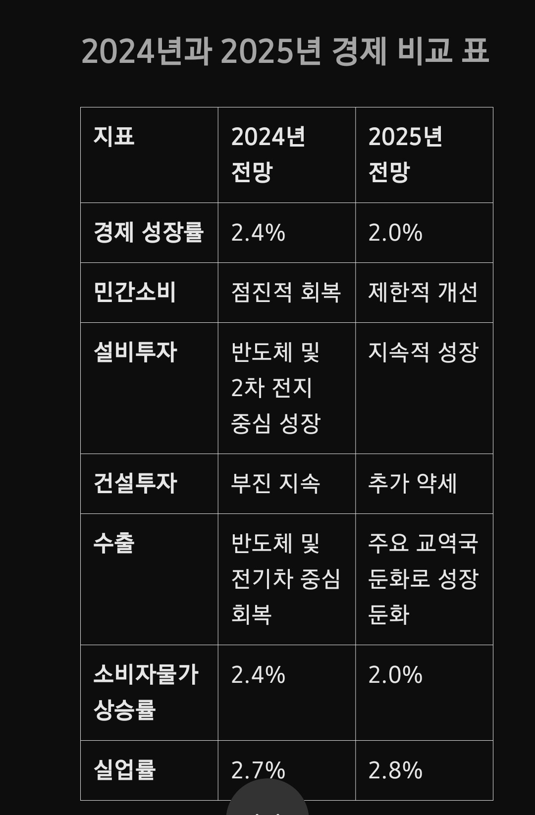 2024년과 2025년은 모두 경제 성장 둔화와 대내외 불확실성 속에서 정책적 대응이 중요합니다. 정부와 기업은 내수 활성화, 신성장 동력 발굴, 대외 리스크 관리에 초점을 맞추어야 합니다.
