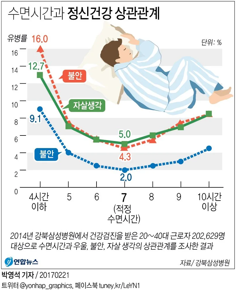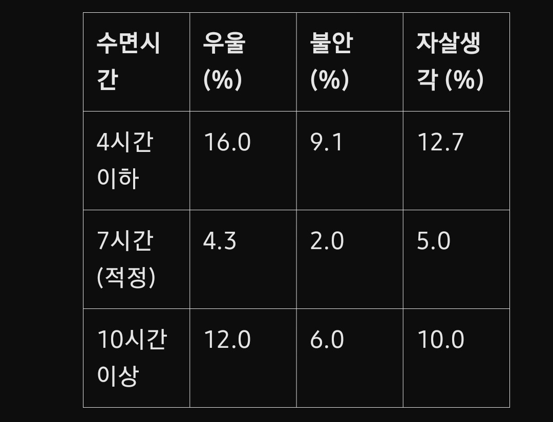 수면은 단순한 휴식 이상의 의미를 가지며, 정신건강의 중요한 지표입니다. 하루 7시간의 적정 수면을 유지하려는 노력은 우울, 불안, 자살생각을 예방하는 데 큰 도움을 줄 수 있습니다. 또한, 규칙적인 수면 습관과 함께 신체적, 정신적 건강을 동시에 관리하는 것이 중요합니다.