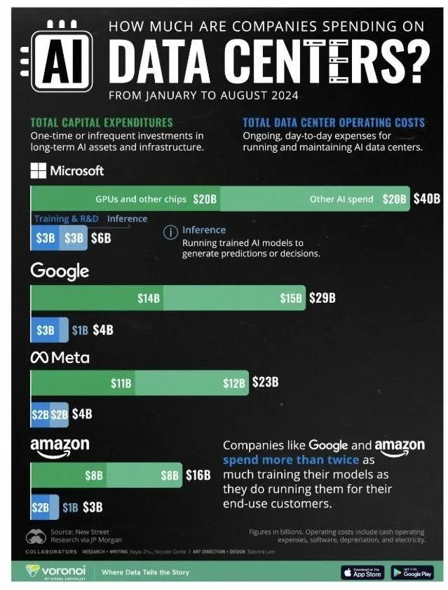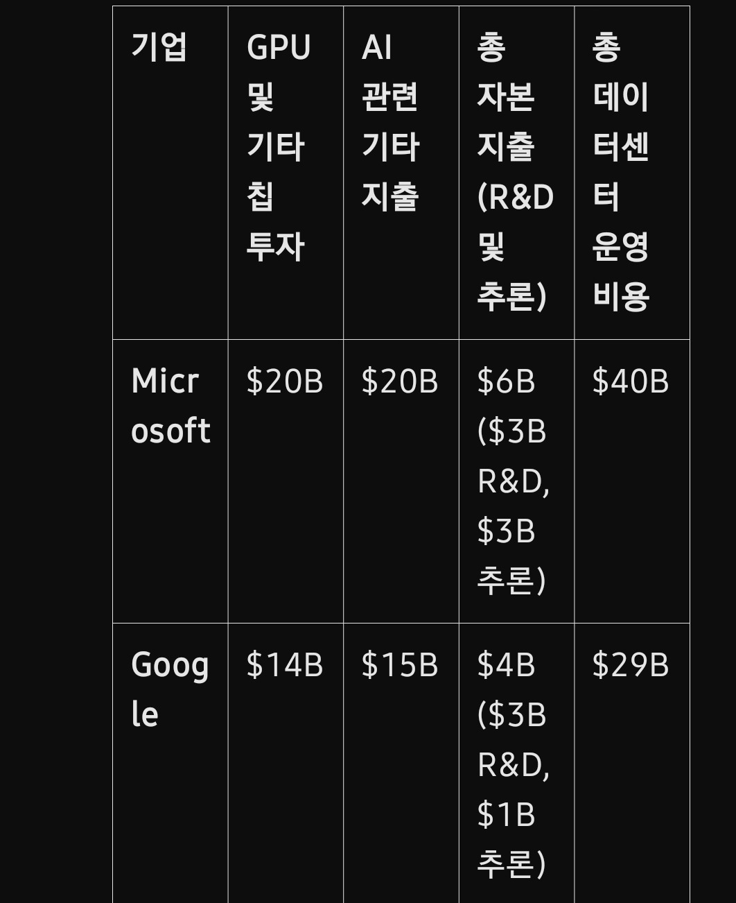 Microsoft가 400억 달러로 가장 높은 운영 비용을 기록하며, 대규모 AI 모델 운영을 위한 인프라를 구축하고 있습니다.